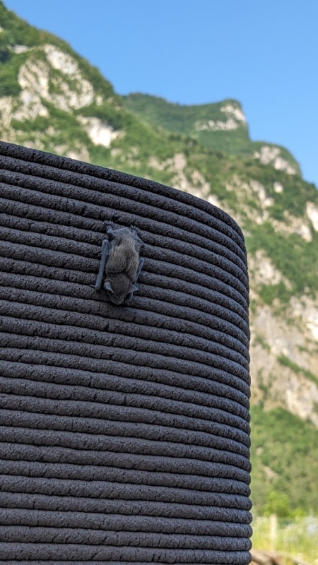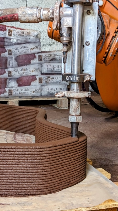 Un braccio robotico l’ha costruita stampando in 3D e stratificando impasti a base di calce naturale, cenere di lolla di riso e alcuni residui di Tonalite dell’Adamello, una roccia trentina, fornita dall’azienda Graniti Pedretti, priva di valore commerciale. La messa a punto dei materiali si deve alla collaborazione tra Calchèra San Giorgio (Grigno Valsugana) e il Politecnico di Milano, ed è valsa anche il deposito di un brevetto sui diversi formulati, mentre i blocchi sono stati realizzati da Erratic (Valdagno). La tecnologia di stampa è prodotta in house.