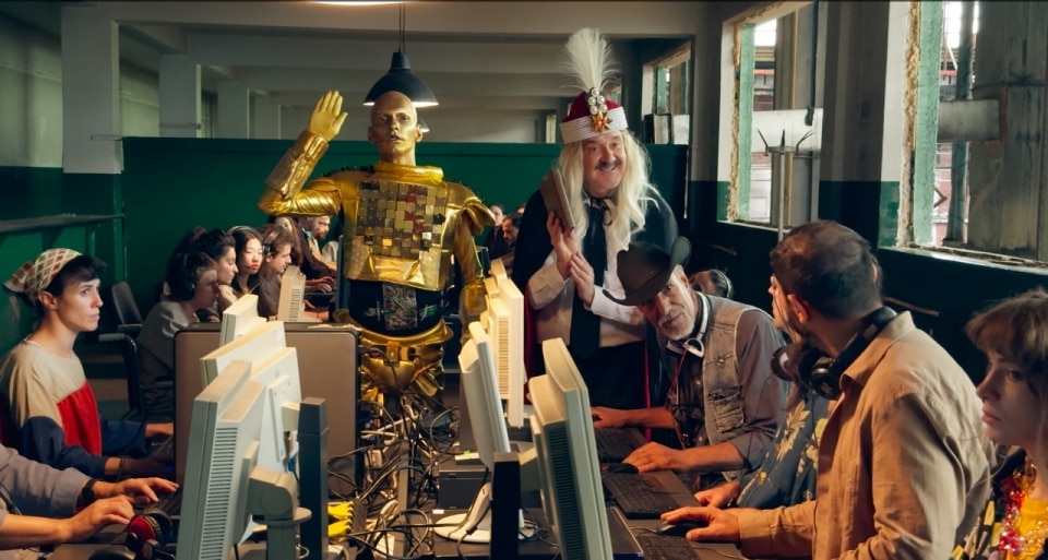 AI, prima di tutto. Quintali di AI come personaggio attivo, più co-protagonista che strumento. In una rappresentazione di quelli che sono i processi creativi contemporanei, una metafora neanche troppo astratta dei design process, si parte dal regista in crisi creativa – alter ego di Jude, interpretato dal suo attore feticcio Adonis Tanța, qui presente in altri ruoli – che chiede soggetti per storie di vampiri a una intelligenza artificiale transilvana dedicata. E ci si inoltra in un viaggio tra l’inferno e Miami Beach (sempre che siano distinguibili) dove Dracula di volta in volta può uscire da un suo stesso film nella sala tv di una clinica postsovietica per anziani miliardari, tradursi in mostracci anni ’60 generati in forse 20 secondi di elaborazione, oppure evocare come manager di azienda sfruttatrice una mini-apocalisse zombie con gli soldati che nel 1933 aprirono il fuoco su lavoratori in rivolta. O si incontra l’ormai centenario Nosferatu di Murnau, stavolta bombardato di pubblicità porno, rigorosamente vintage.