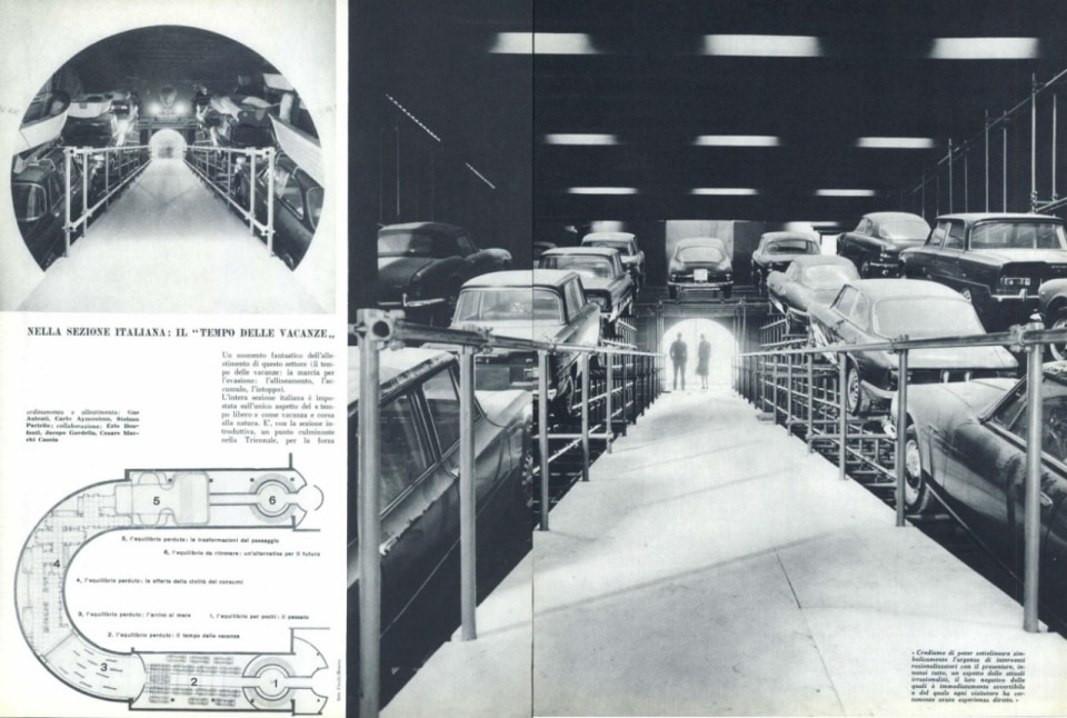 E c’è quel nodo di tutti i percorsi che sta a Milano, in Parco Sempione, poco distante da quella casa che conteneva la biblioteca di Eco, ordinata per affinità: è il Palazzo dell’Arte, dove Eco e Vittorio Gregotti curano l’introduzione alla XIII Triennale nel 1964, l’ultimo episodio di un ciclo destinato a chiudersi coll’episodio successivo, quello del 1968 preso d’assalto dalla contestazione alla sua apertura. In questo canto del cigno moderno, il tema è il tempo libero, Gae Aulenti accoglie il pubblico con le figure del suo “Arrivo al mare”, troviamo poi il dream team del design italiano al completo, tra Albini e Helg, Joe Colombo, Zanuso e Sapper. E troviamo i corti sperimentali di un Tinto Brass appena trentenne.