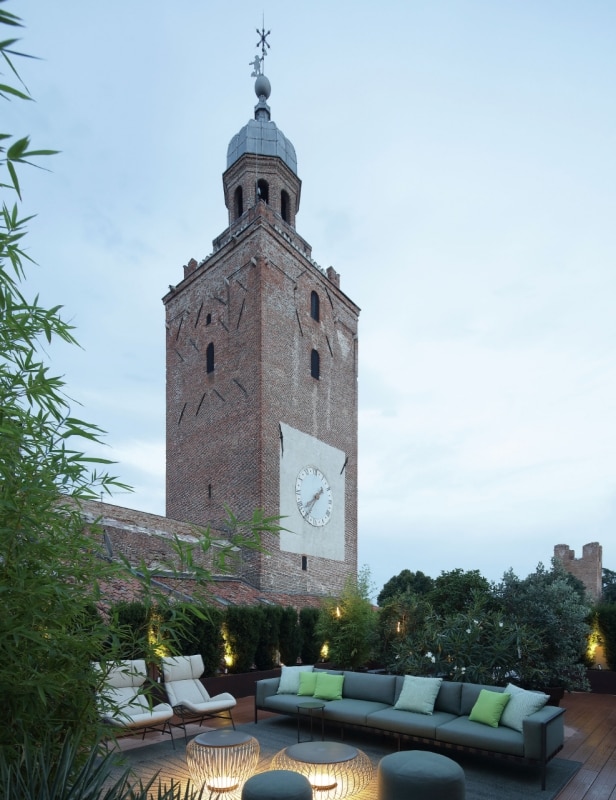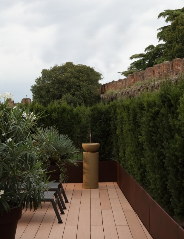 Sul terrazzo affacciato alle mura, tra siepi di tasso che ne seguono le linee nette, trova spazio il lavabo freestanding Saba 37 in argilla Senape con rubinetteria Pvd nero. Anche qui il linguaggio resta minimale, lasciando che siano le mura due-trecentesche a dominare la scena.