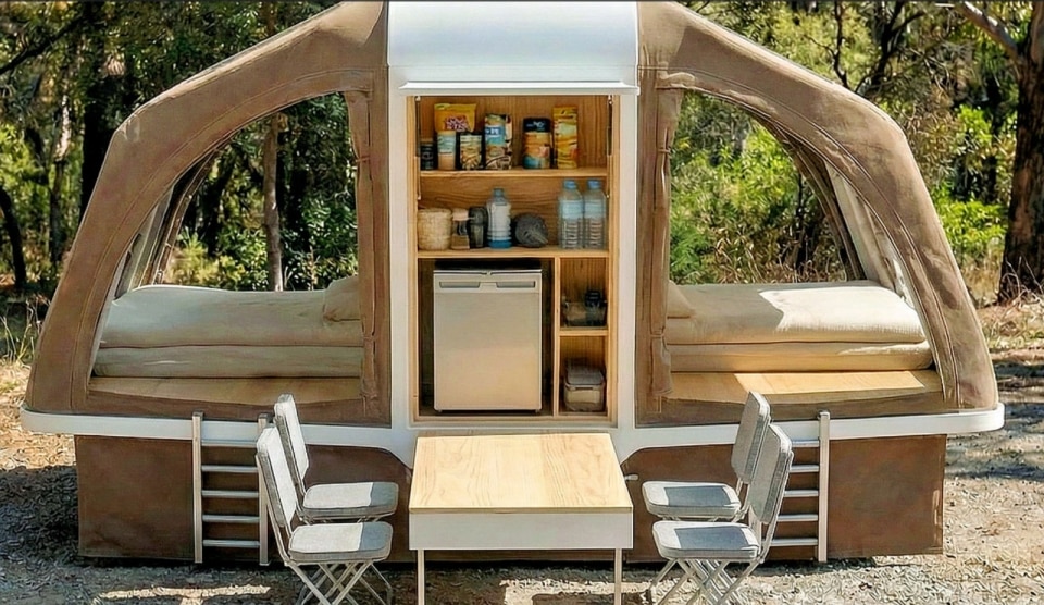 Il modulo chiuso misura 2,5 × 1,2 metri per 2,1 metri di altezza. La struttura rigida centrale si espande grazie a un sistema a fisarmonica: due elementi laterali in materiale plastico pieghevole ma resistente si dispiegano verso l’esterno, aumentando la superficie interna e definendo una copertura arcuata. Il principio è quello del dispositivo trasformabile, dove arredo e architettura coincidono in un unico meccanismo — una logica progettuale che richiama l’approccio sperimentale di Joe Colombo.