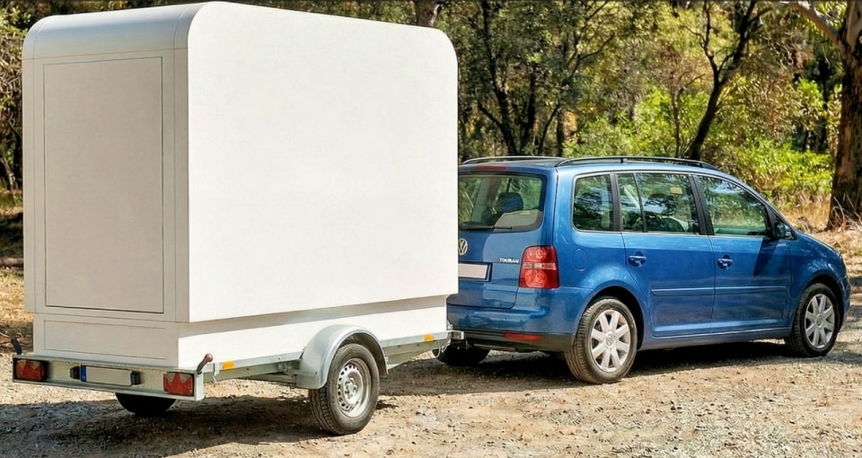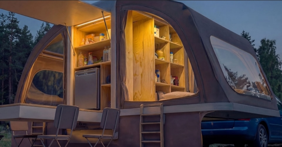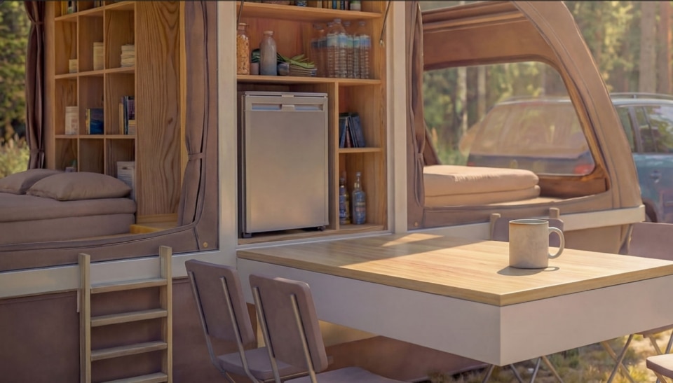 All’interno lo spazio è organizzato con logica compatta: posti letto, moduli per la conservazione e la preparazione dei cibi, contenitori in legno massello ancorati al nucleo centrale. Un tavolo estraibile completa la dotazione, pensato per essere utilizzato all’esterno insieme a sedute richiudibili.