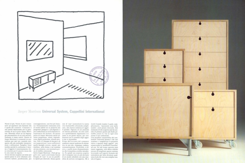 Per l’Universal System, il sistema di contenitori modulari, Morrison si ispirò all’efficienza organizzativa dei computer Apple e alla possibilità di organizzare, mettere via e ritrovare facilmente i documenti. Allo stesso modo i suoi cassetti “infiniti” e senza maniglia dovevano rendere facilmente visibili e a portata di mano gli oggetti quotidiani a cui spesso è difficile trovare un posto. La serie, messa in commercio da Cappellini nel 1990 e oggi fuori produzione, sorprese per l’assoluta essenzialità delle forme e per la scelta del legno. Qualcuno vi riconosceva un’influenza scandinava, altri un certo giapponismo nel rigore dei moduli, ma anche stavolta è impossibile costringere il prodotto in qualsiasi categoria.