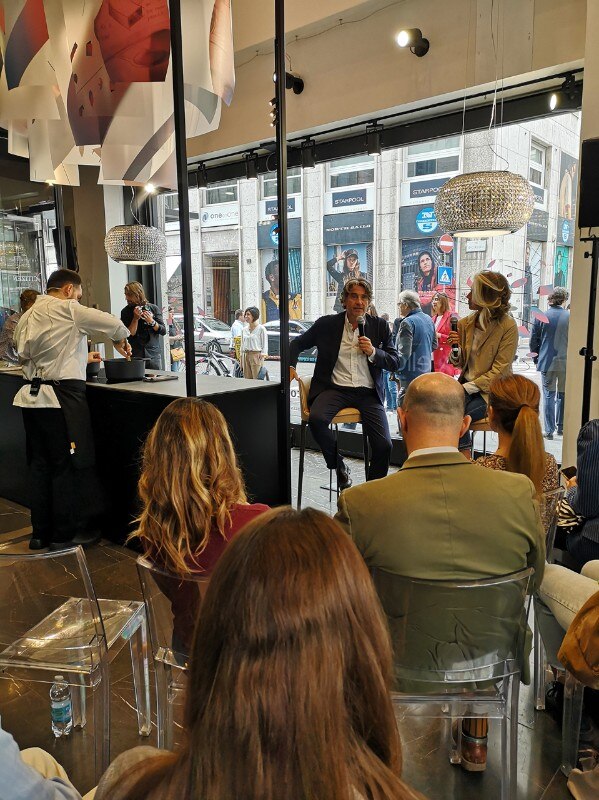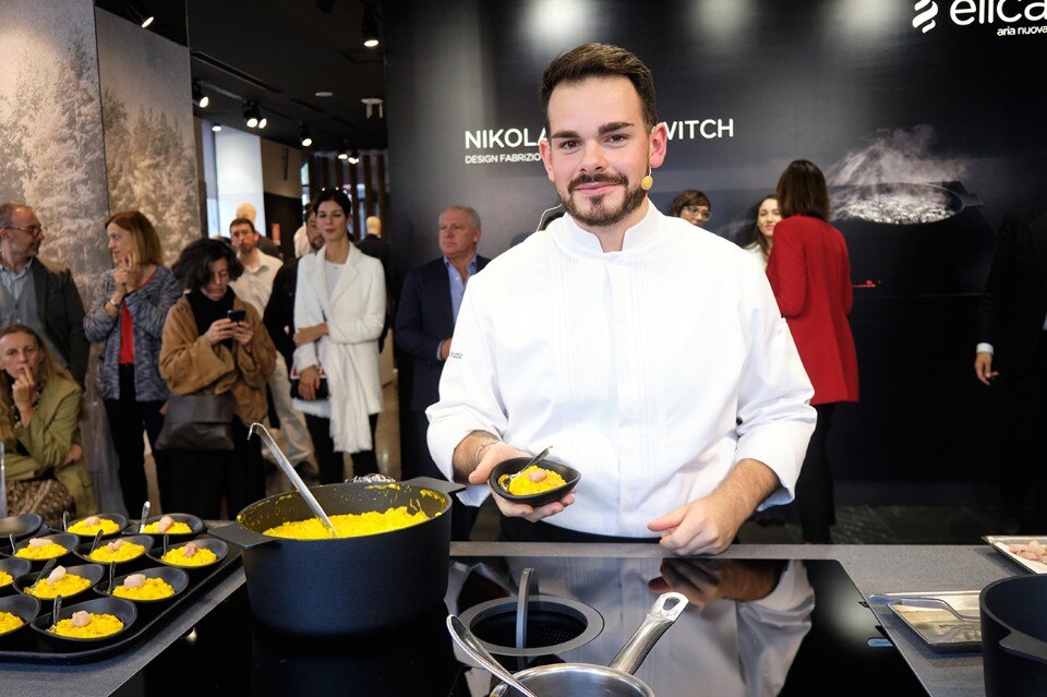Mentre si svolgeva l’intervista, lo chef Matteo Torretta ha preparato un risotto studiato ad hoc per gli ospiti, direttamente sul piano cottura aspirante NikolaTesla Switch, prodotto di punta dell’azienda di Fabriano. La sorpresa del piatto è stata perfetta, durante la cottura nessun odore la aveva anticipata.