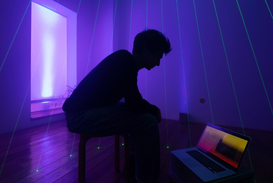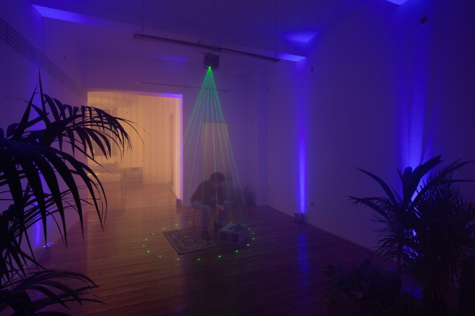 Attraverso 20 raggi provenienti da una sorgente luminosa sospesa, il collettivo ferrarese circoscrive e delimita uno spazio a terra, associando al più futuristico dei materiali il più primitivo dei rifugi.