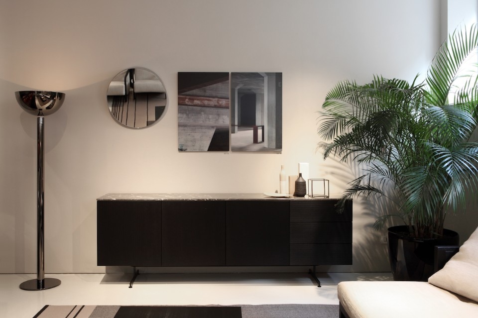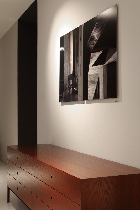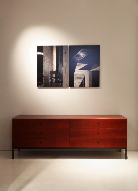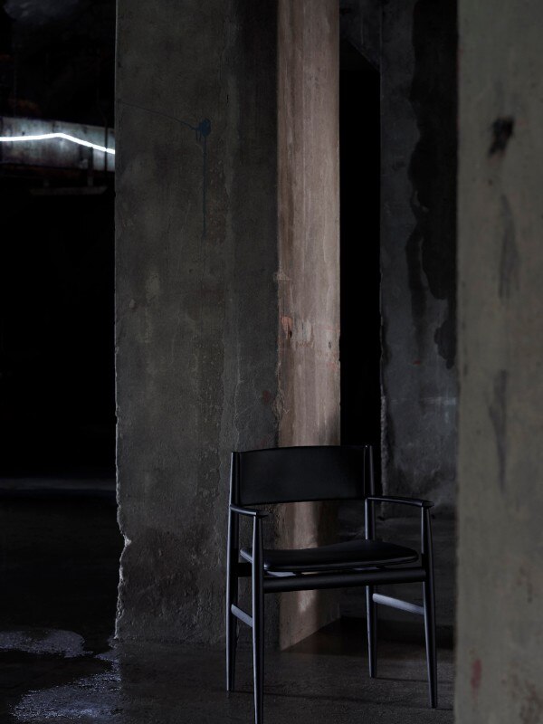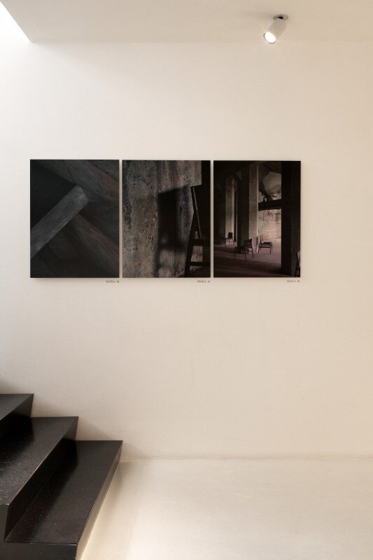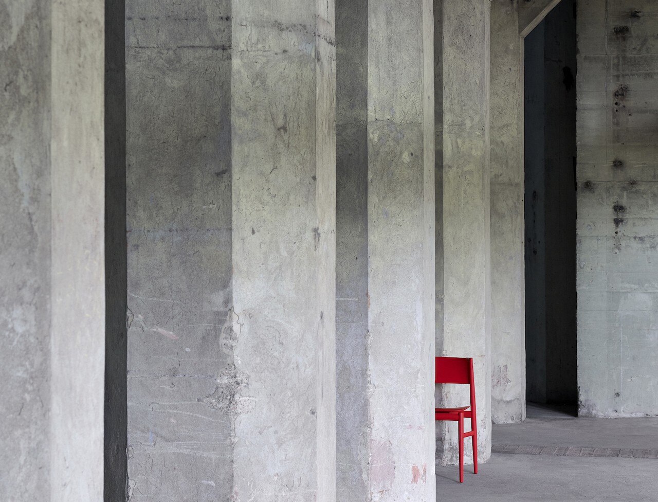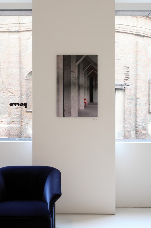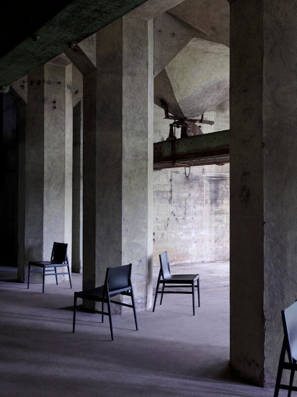 Tra gli scatti di “Visual Thoughts” ci sono visioni in chiaroscuro che interpretano il design dell’arredo. Le fotografie della vecchia struttura architettonica del magazzino di Leiden, città situata vicino ad Amsterdam, vedono arcate e pilastri di cemento ospitare i pezzi disegnati da Piero Lissoni, come la sedia Neve in frassino tinto rosso e il tavolo Metallico, e le sedie Voyage di Gamfratesi rivestite di pelle nera.