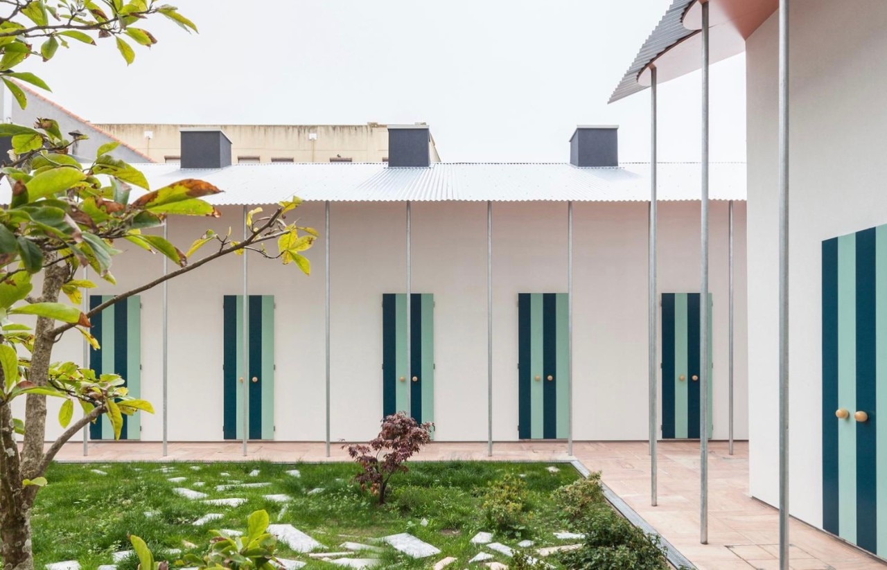 All’esterno, le case sono definite da un colonnato continuo che incornicia un giardino collettivo dove diventa impossibile capire dove ogni casa inizia o finisce. La facciata è una sovrapposizione di più file ritmiche: le sottili colonne metalliche, le porte a strisce blu, i lucernari a cassettoni neri. Il tetto è composto da due strati: sotto le lamiere metalliche è fissato un piano ondulato di colore rosa che sottolinea la sottigliezza della superficie. Tutto intorno, lo scenario urbano più onesto e bello definisce lo sfondo di un tale esercizio architettonico.