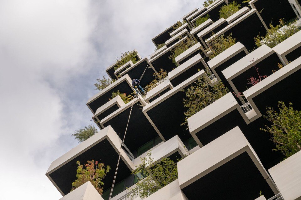 Le chiome degli alberi al piano inferiore, le terrazze e le vasche verdi poste a differenti quote, un’evoluzione rispetto al Bosco Verticale milanese, danno una percezione del verde molto variegata e fanno sì che ci si senta avvolti dalla natura. La profondità della facciata dona un senso di protezione che anche all’ultimo piano esclude qualsiasi vertigine.