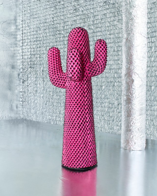 Presentata in occasione del cinquantesimo anniversario dell’appendiabiti a forma di pianta famoso in tutto il mondo, l’edizione del Cactus Andy Warhol x Gufram è realizzata con lo stampo originale del 1972, scolpito e rifinito a mano da artigiani specializzati. Le 2.165 borchie poliuretaniche che caratterizzano la superficie vengono poi verniciate con Guflac, la vernice brevettata da Gufram che rende la superficie simile alla pelle, pur mantenendola morbida e flessibile.