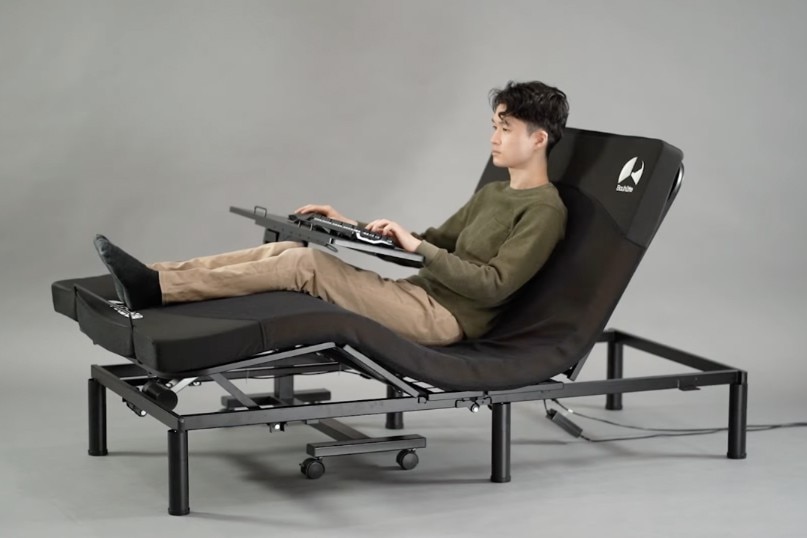 Il “gaming bed” ha un solo scopo: aiutare i gamer più hardcore a evitare ogni minima attività fisica. La struttura include un carrello per vivande, diversi ripiani, portabevande per le tazze di caffè e per i beveroni tiepidi ad alto contenuto di taurina e persino un braccio mobile per tenere lo smartphone il più vicino possibile agli occhi mentre si è coricati.