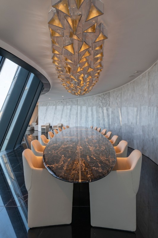 I sessantadue piani della torre sono scanditi da sky lobby, che fanno da aggregatore sociale per i dipendenti e offrono spazi per riunioni. Alla base della torre, una lobby alta 18 metri accoglie dipendenti e visitatori. Il diciassettesimo piano ospita un scenografico ristorante a doppia altezza; il diciottesimo una palestra, e al trentasettesimo ci sono una sala da ballo e un auditorium. All’apice della torre si trova l’ufficio del direttore, con un iconico lucernario che traccia un arco nello ambiente e offre una vista panoramica sulla città e sulla costa.