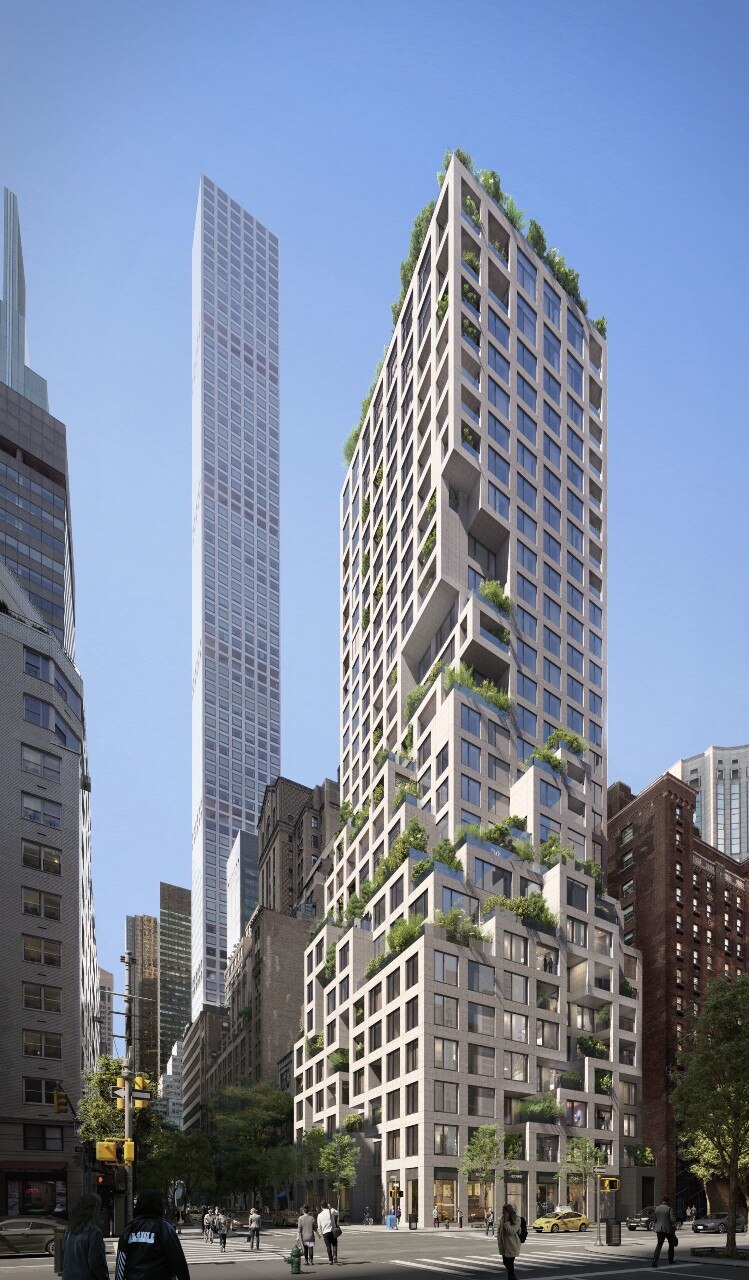 L’ingresso principale sarà sulla 57a strada. I residenti attraverseranno una portale in rame lucido per raggiungere un atrio di 6 piani con vista su un giardino panoramico. Una galleria condurrà poi alla lobby e all’accesso alla torre residenziale di 28 piani. Sulla 56th ci sarà un ulteriore ingresso per le automobili.