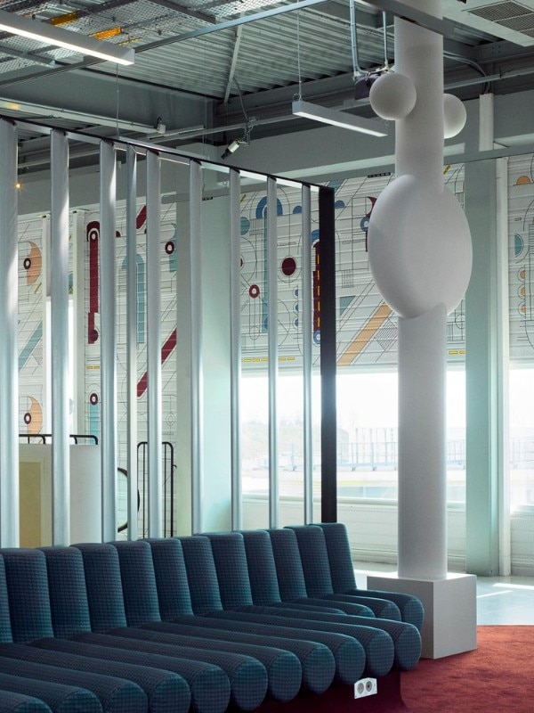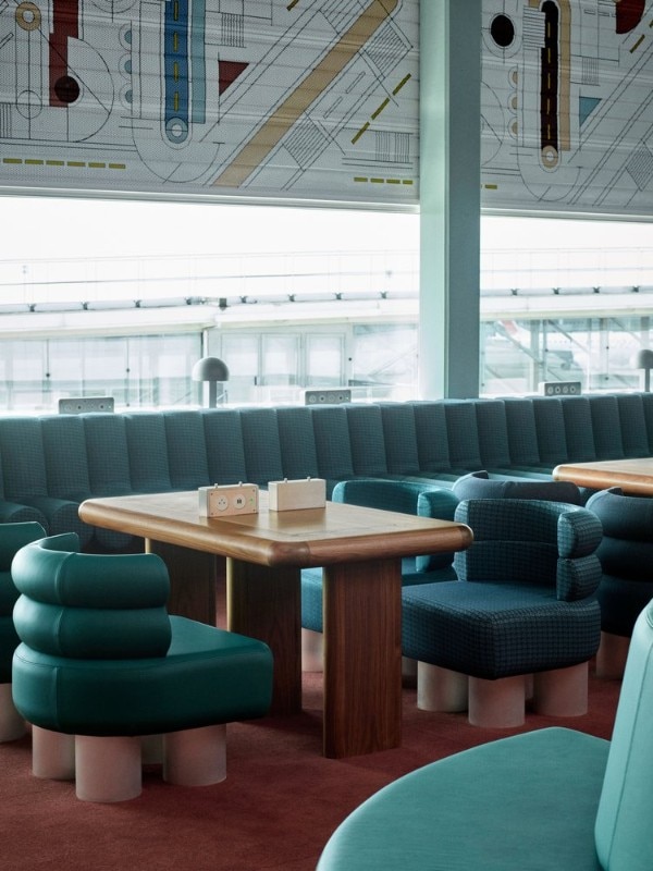 Le sedute arrotondate – in tappezzeria blu scuro e verde – ispirate al design degli anni Sessanta e Settanta, sono disposte in panchine e coppie; e per differenziare lo spazio e offrire privacy ai passeggeri, Chzon ha aggiunto partizioni e sculture bianche dello studio d’artista Les Simonnets, che servono anche da sedute alternative.