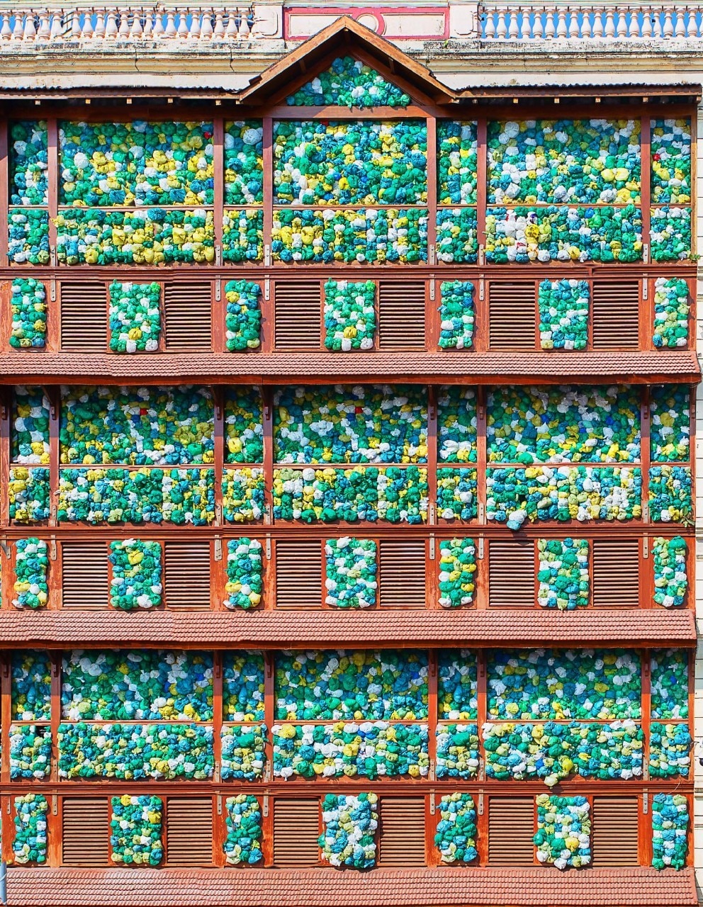 Finalmente, anche il governo indiano ha bandito da poco l’uso di borse non riciclabili o di plastica, così Luzinterruptus ne ha raccolte più di 8mila attraverso un annuncio, per poi installarne nella facciata della Evelyn Guesthouse, stipando completamente ogni sua apertura e creando l’effetto che la plastica stesse straripando dall’edificio.
