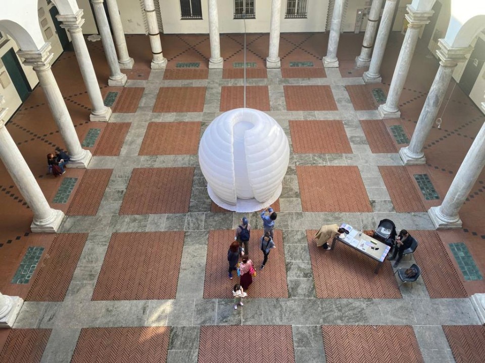 Eva Frapiccini, Dreams' Time Capsule, 2011-2023. View da Palazzo Ducale, Genova, 2022. Il design della capsula e delle strutture di Dreamscape è stato realizzato in collaborazione con il designer Michele Tavano.