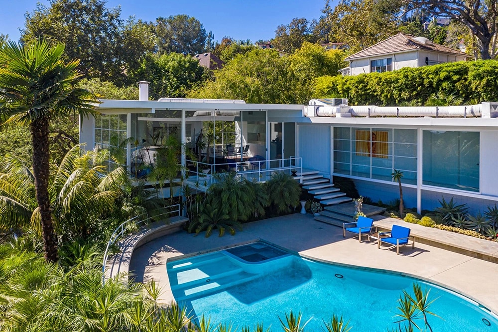 La casa ha un soggiorno con camino moderno, cucina, tre grandi camere da letto, un bagno principale, cabina armadio azzurra, moquette blu, un patio che si affaccia sulla piscina e l’immancabile terrazza da cui vedere le scintillanti luci di Los Angeles. C’è anche una vasca idromassaggio immersa tra le piante tropicali e una sauna indipendente.