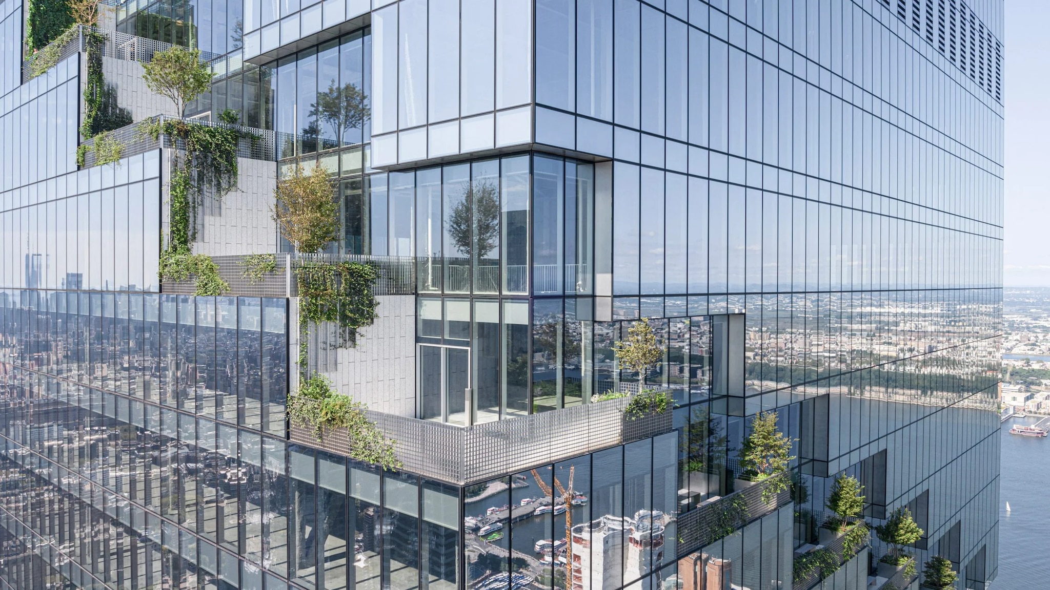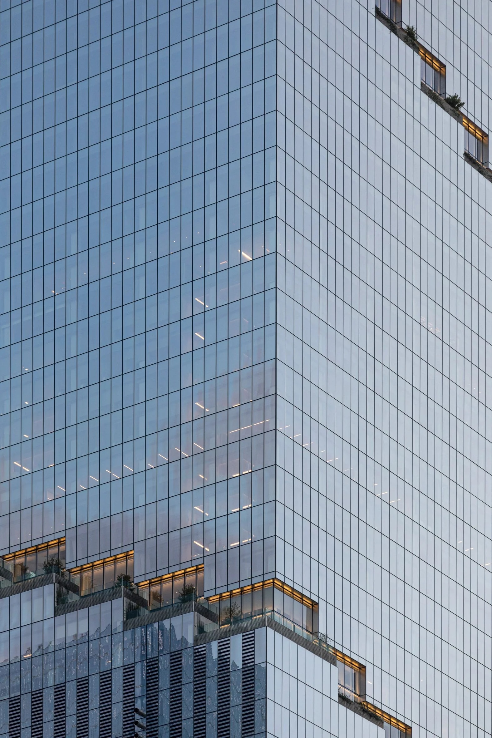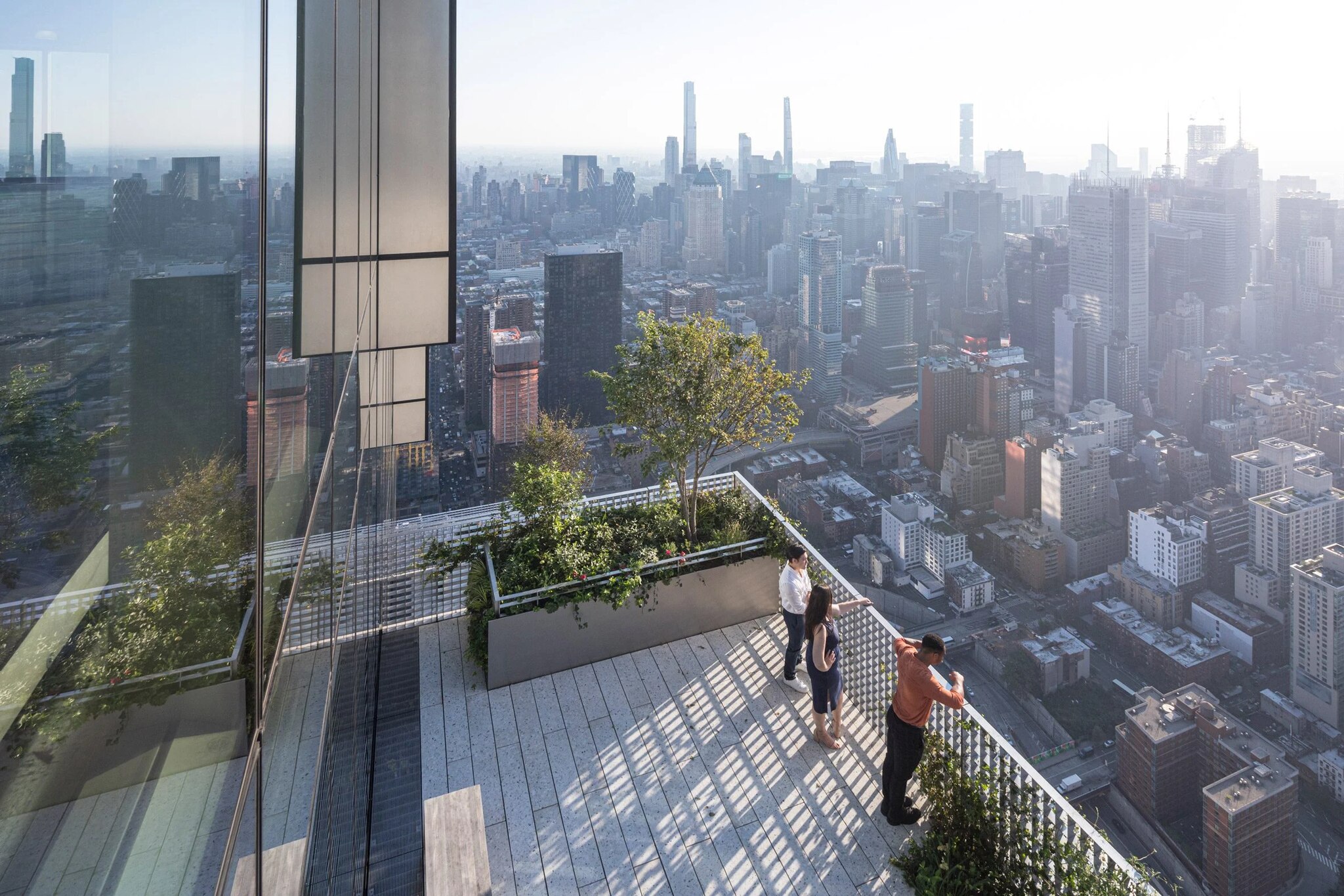 Le aperture di vetro incassate dei livelli inferiori, salendo verso l’alto si trasformano in terrazze a gradoni – per un totale di 1,207 metri quadrati – rastremando così il volume complessivo della torre verso la cima. Questa è una tipica caratteristica di altri grattacieli iconici di Manhattan, come l’Empire State Building e il Rockefeller Center.