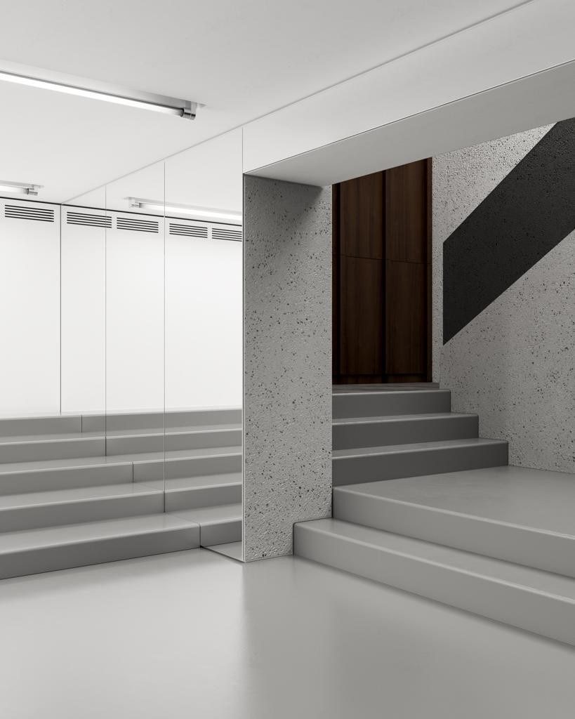 Inoltre, un piano interrato servirà per ospitare incontri, mostre e conferenze. La stanza, caratterizzata da lunghe gradinate che delimitano una zona centrale, è stata immaginata come uno spazio espositivo e vi si accede grazie a una grande scala che ospita una libreria in noce concepita come “un’opera permanente” e che fa da elemento di congiunzione tra i piani. Un sistema di tende è stato progettato per suddividere all’occorrenza gli spazi in modo flessibile.