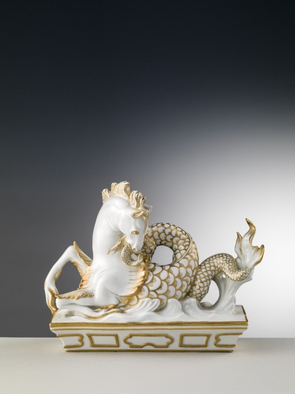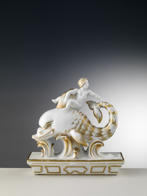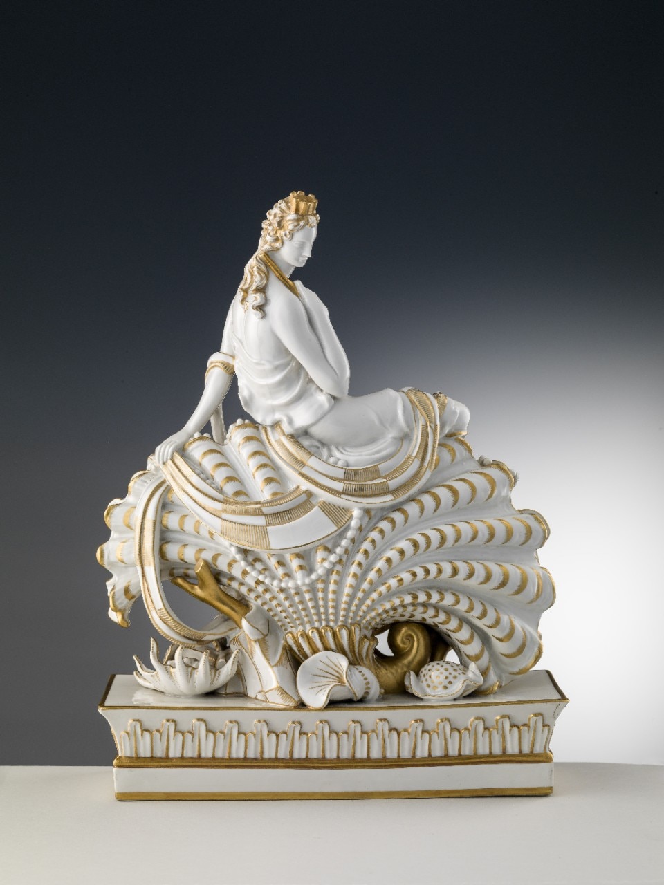 Il centrotavola, ideato tra il 1927 e il 1929 da Gio Ponti con la collaborazione di Tomaso Buzzi (che peraltro realizzò per Villa Necchi due grandi consoles decorate con arazzi di Bruxell del XVI secolo) e modellato da Italo Griselli per la Richard Ginori, nella storica Manifattura di Doccia, reinterpreta un oggetto neoclassico – i sontuosi centrotavola che imitavano la spina di un circo romano – in stile Art Déco. La scultura è centrata sulla figura allegorica dell’Italia adagiata su una conchiglia e circondata da animali araldici e altri piccoli elementi in porcellana.