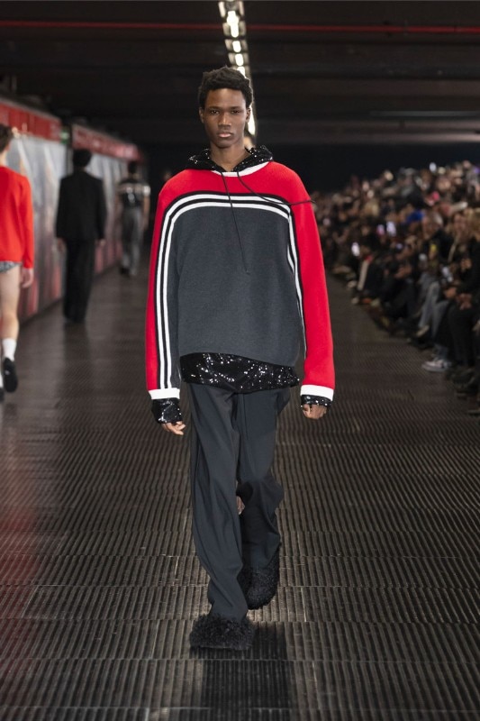 Gli stilisti hanno scattato foto con le funzionalità IA di Pixel 8 e Pixel 8 Pro nella metropolitana di Milano, che sono poi state rielaborate per creare i pattern stampati sui capi. Spicca a questo proposito l’omaggio al design razionalista di Franco Albini e Franca Helg (Bob Noorda firmò il celebre sistema di segnaletica) per la precisione dei dettagli, come l’iconico corrimano riportato su felpe e cappotti a mo di logo e anche in mano ai modelli durante la sfilata. La collaborazione, prima nel suo genere, ambisce a unire moda, tecnologia, design, arte e identità urbana attraverso l’uso creativo dell’intelligenza artificiale.