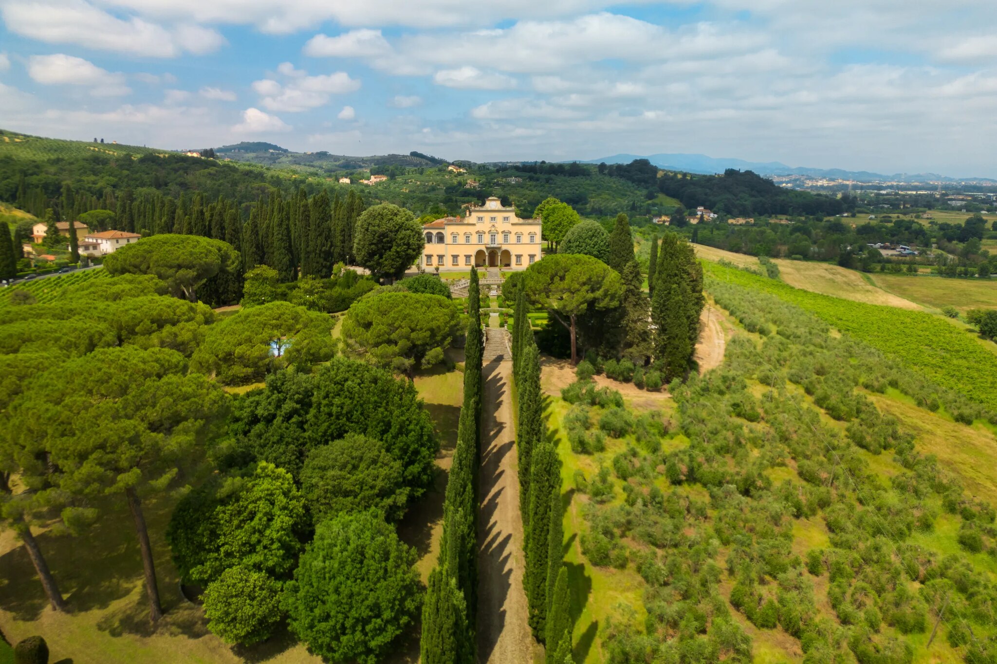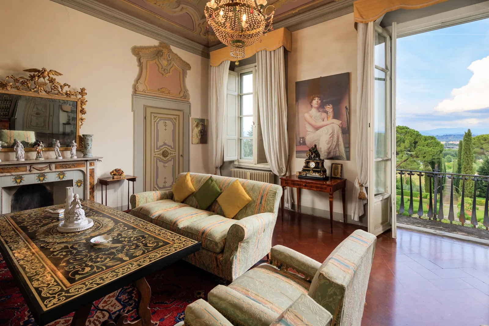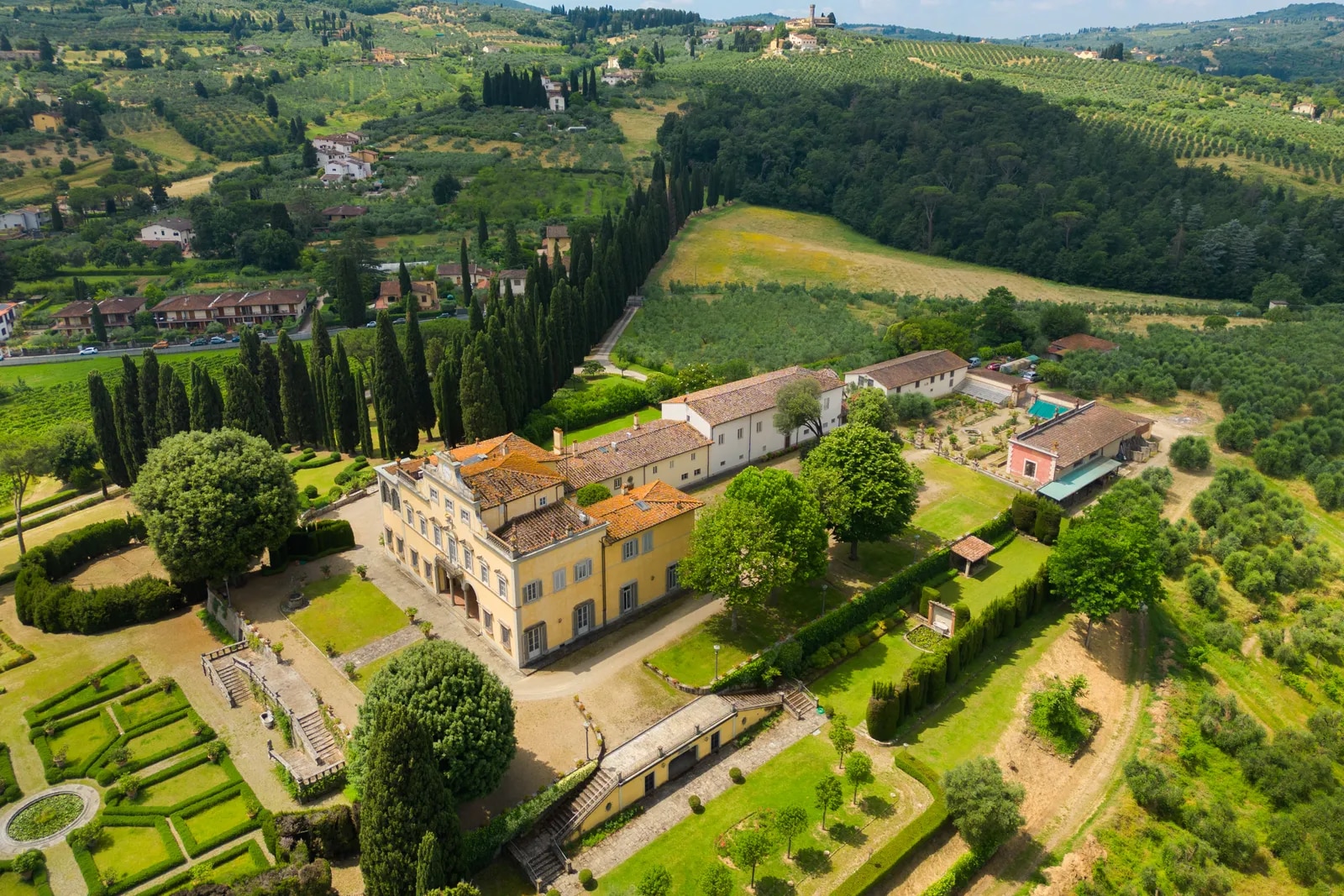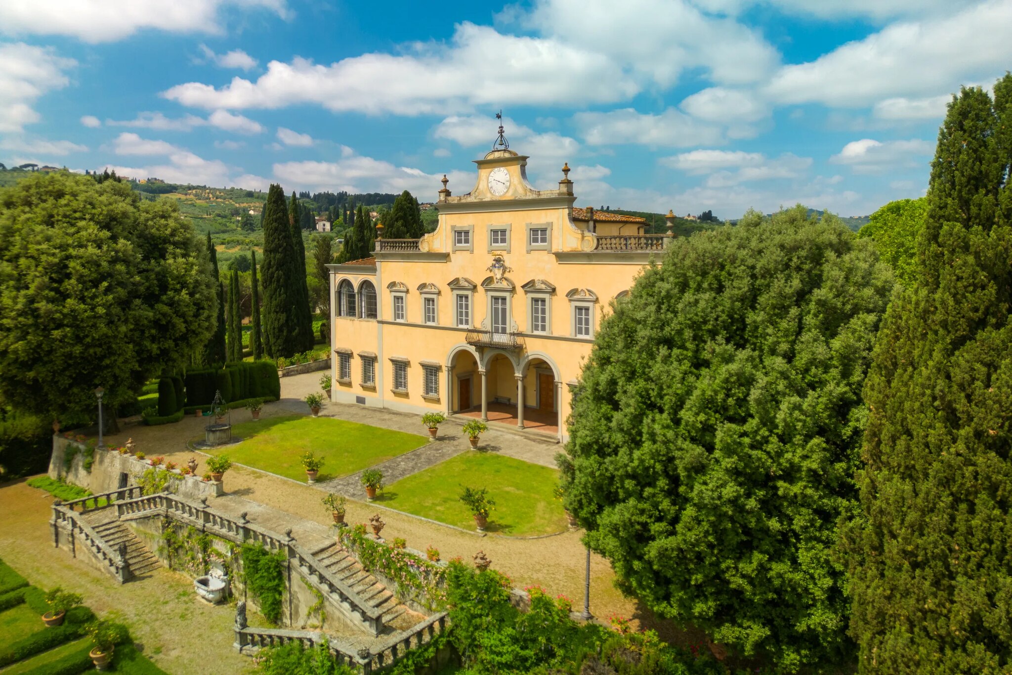 La villa di 2 800 metri quadrati è oggi in vendita per 18 milioni di euro. Con 300 000 metri quadri di parco esterno, la villa principale – a cui si accede con un classico viale alberato di cipressi opera del famoso paesaggista Cecil Pinsent, che si è occupato anche del progetto del giardino – conta numerose dependance ed edifici a uso agricolo, una piscina, un campo da tennis e anche una cappella privata. Una scalinata a doppia rampa porta all’ingresso, da cui si accede ad ampi ed eleganti saloni, cucine, 14 camere di cui una con veranda panoramica, 15 bagni, una biblioteca, una palestra e un grande terrazzo con vista sulla piana Firenze.