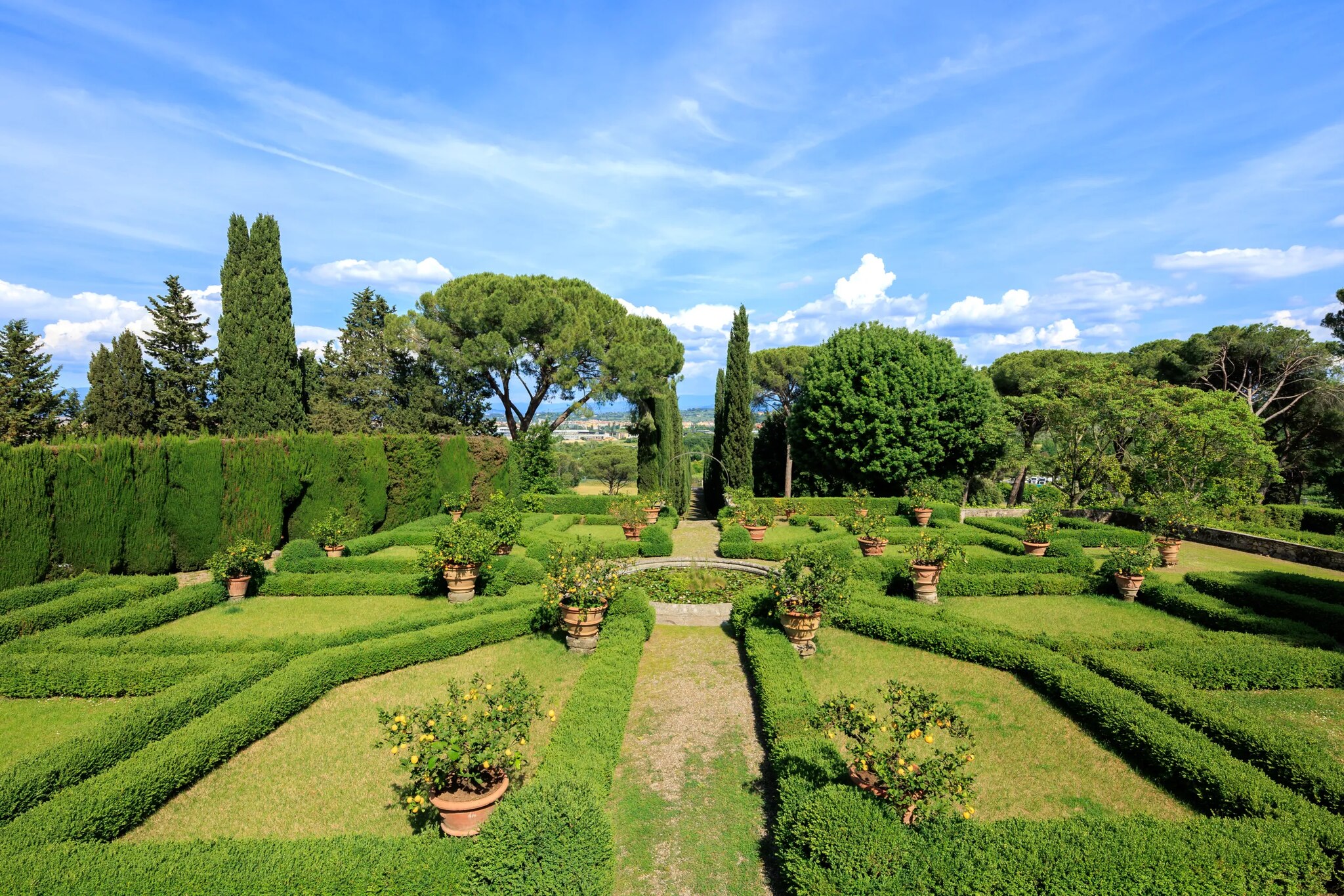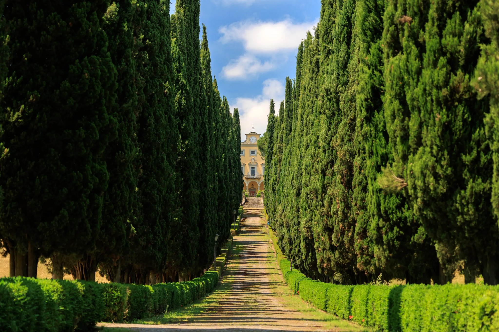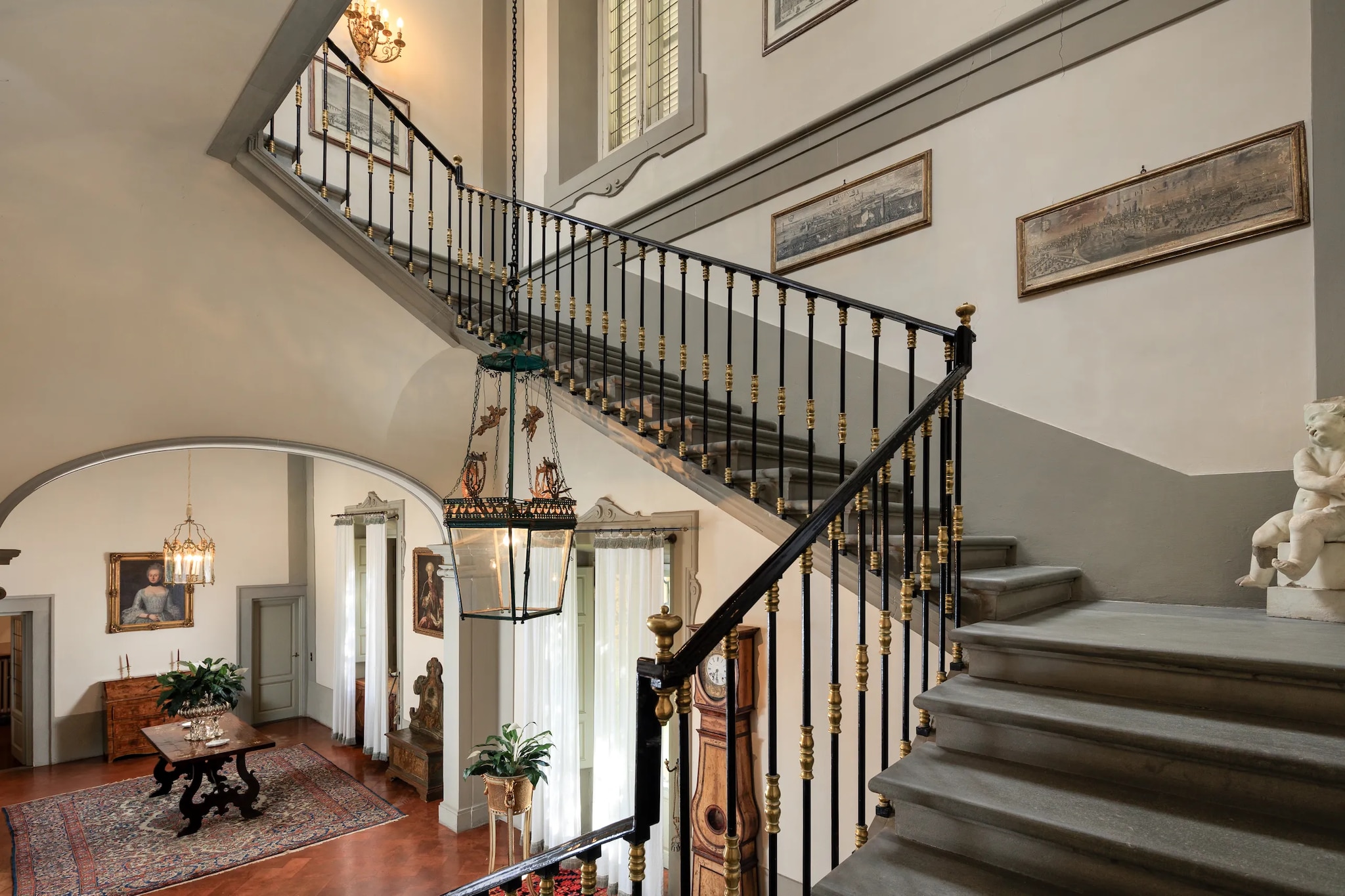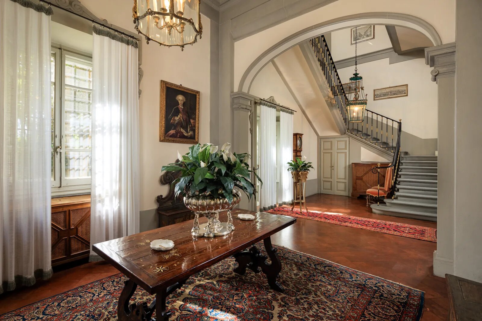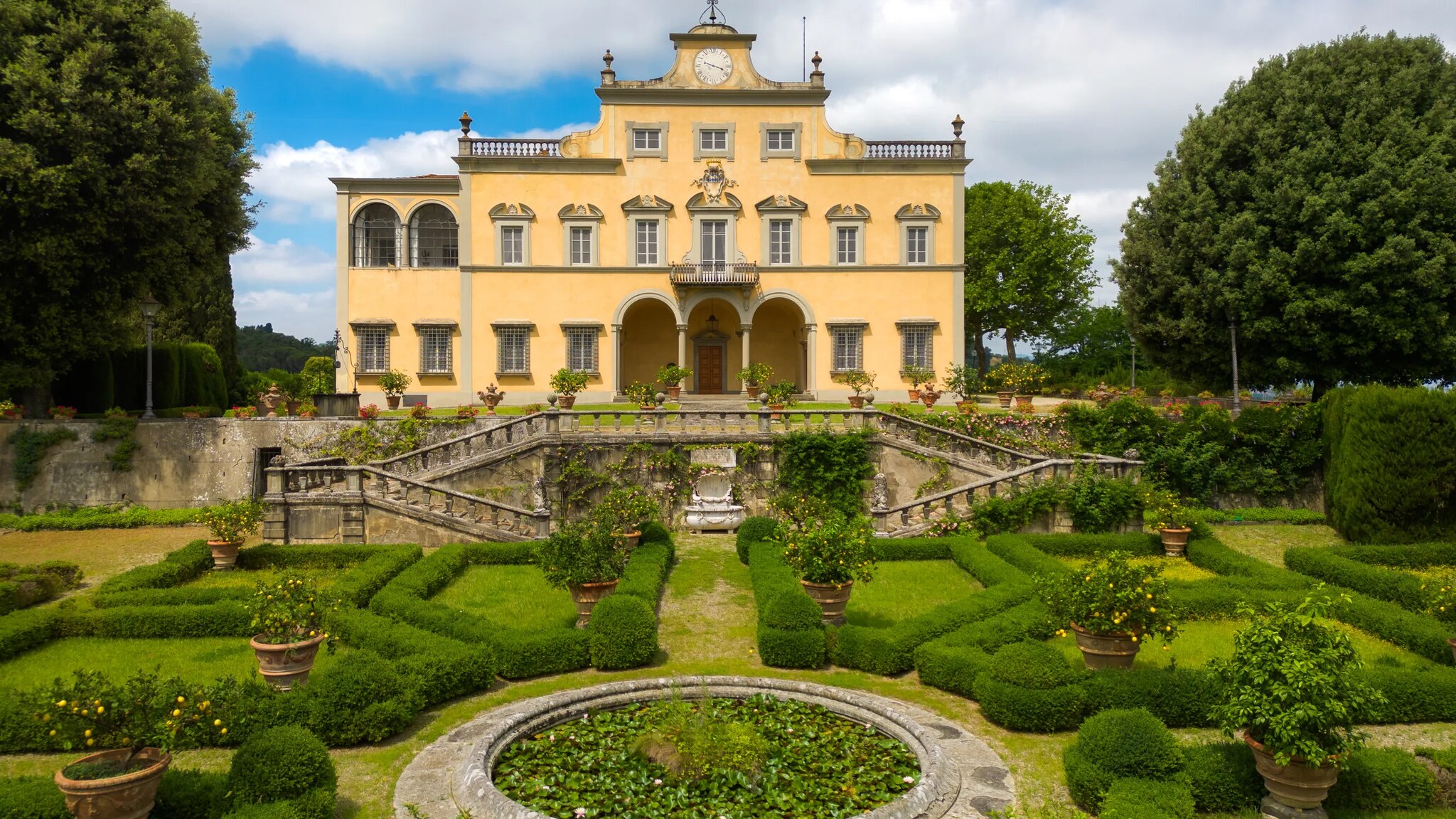 La villa di 2 800 metri quadrati è oggi in vendita per 18 milioni di euro. Con 300 000 metri quadri di parco esterno, la villa principale – a cui si accede con un classico viale alberato di cipressi opera del famoso paesaggista Cecil Pinsent, che si è occupato anche del progetto del giardino – conta numerose dependance ed edifici a uso agricolo, una piscina, un campo da tennis e anche una cappella privata. Una scalinata a doppia rampa porta all’ingresso, da cui si accede ad ampi ed eleganti saloni, cucine, 14 camere di cui una con veranda panoramica, 15 bagni, una biblioteca, una palestra e un grande terrazzo con vista sulla piana Firenze.