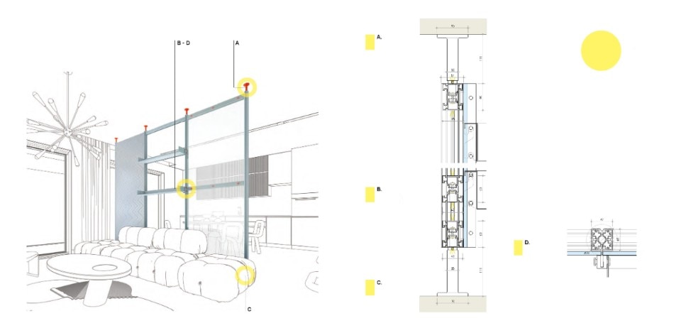 Questo sistema si aggancia a soffitti e pavimenti, abbattendo i tempi di cantiere. Quando il prodotto arriva al termine del suo utilizzo i suoi componenti possono essere riciclati o riutilizzati in nuove applicazioni; grazie al sistema modulare, è possibile intervenire con la sostituzione dei soli pannelli danneggiati o obsoleti, evitando interventi sull'intera struttura e riducendo così gli sprechi.