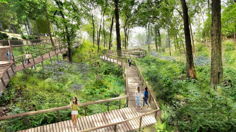 Forme morbide e sinuose di ispirazione organica, connesse da trama di percorsi sopraelevati nel verde, si intrecciano con l’orografia del sito suggellando un legame indissolubile con il paesaggio.