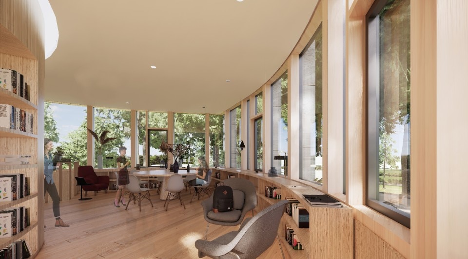 Le tonalità e le textures della foresta circostante rivivono nella palette di materiali reperiti localmente (dal legno di quercia bianca, alla pietra naturale del Wisconsin, al calcestruzzo) che conferiscono agli ambienti un’atmosfera calda e avvolgente, irradiata di luce che penetra dalle ampie vetrate. Come afferma Jeanne Gang: "Il nostro progetto per il Women's Leadership Center risponde alla bellezza naturale e all'ecologia che lo circonda, comprese le viste sui boschi di querce e sul vicino lago. Il design del tetto porta luce in profondità negli spazi interni come gli spazi vuoti nella chioma degli alberi. I diversi ambienti creano opportunità uniche per riunirsi, riflettere e vivere la natura".