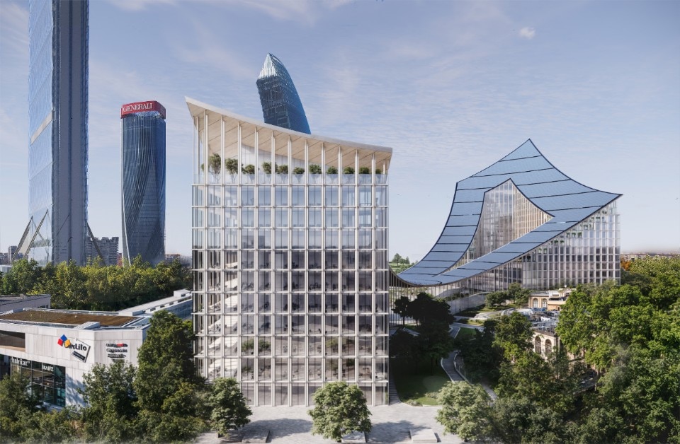 Rompendo radicalmente con lo schema originario dal bando di concorso che prevedeva due edifici verticali, e rinunciando a qualsiasi competizione con gli svettanti grattacieli limitrofi di Zaha Hadid, Studio Libeskind e Arata Isozaki, Bjarke Ingels ha proposto una soluzione progettuale fortemente connotata che re-immagina la nuova porta di accesso a CityLife come un grattacielo “sdraiato” al contempo rappresentativo e informale. Due corpose costruzioni a corte, alte rispettivamente 105 e 53 metri, connesse al piano stradale da una piazza pedonale, ripropongono la memoria degli storici “edifici gemelli” che marcavano l’ingresso a viali o quartieri meneghini. In sommità, una ciclopica pensilina a forma di catenaria lunga 140 m in legno e acciaio, ricoperta da pannelli fotovoltaici, collega i due fabbricati in un gesto urbano simbolico e unificante che marca il nuovo portale di ingresso al quartiere. Una trama di esili colonne d’acciaio disegna i prospetti degli edifici stemperandone la consistenza massiva e riallacciandosi alla tipologia dei porticati lombardi mentre finiture in pietra (di recupero) e vetro rimandano alla matericità del quartiere circostante.