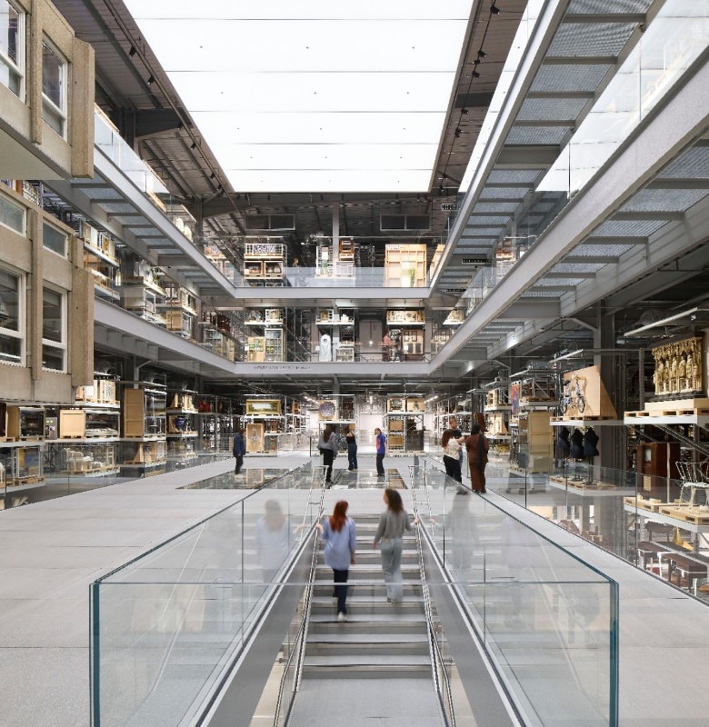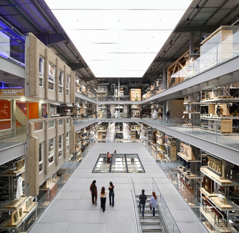 V&A East Storehouse si colloca nell’ex centro di trasmissione per le Olimpiadi del 2012 e comprende 250.000 oggetti, 350.000 libri e 1.000 archivi provenienti dalla collezione del V&A (dall’architettura, al design, alla moda, alla scultura, al teatro), ora ospitata nel deposito di Blythe House nell’area ovest di Londra. L’edificio è un guscio opaco e minimalista, distribuito su quattro livelli e con una superficie di 16.000 mq, eroso all’interno da un vuoto centrale attorno a cui ruotano gli spazi di stoccaggio/deposito/esposizione in un intreccio di scaffalature metalliche e percorsi.