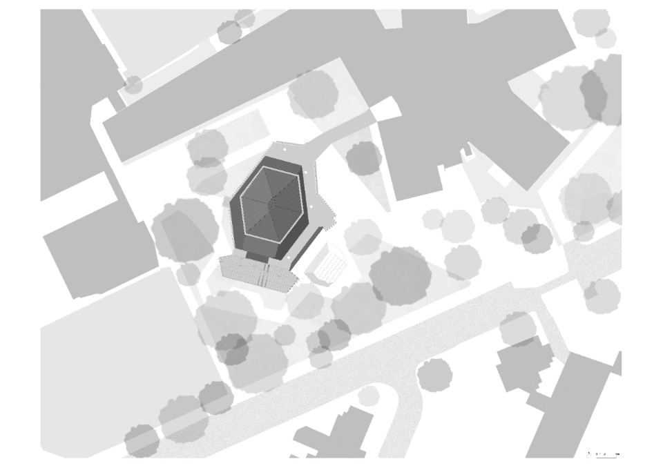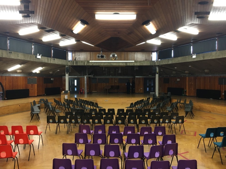 La sala è un manifesto di “etica” brutalista nelle forme e nei contenuti: il volume essenziale con materiali schietti e naturali (legno e cemento) declinati senza intermediazioni formali era concepito come cuore pulsante del complesso per ospitare una pluralità di funzioni e rimarcare il valore comunitario dell’istituzione scolastica. Da tempo utilizzata dall’ Orchestra of the Age of the Enlightenment, nel corso del tempo la sala è stata oggetto di modifiche incongrue che ne hanno alterato lo spirito originario.