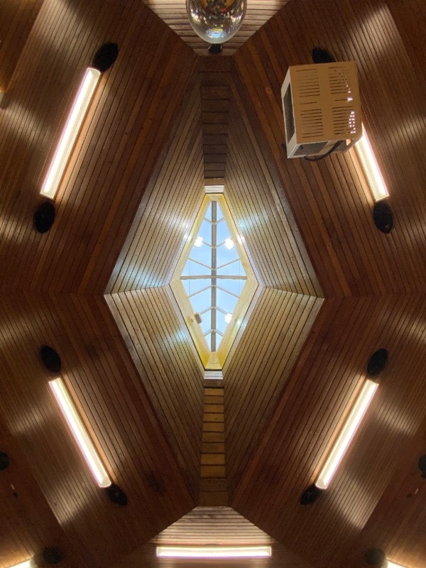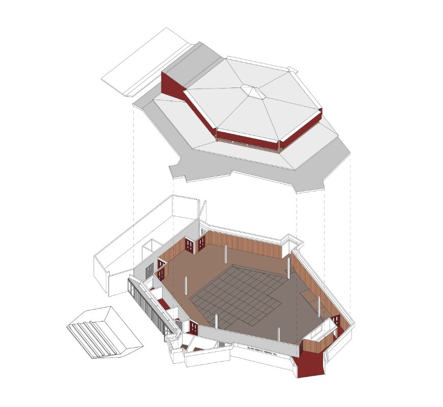 A realizzarla – per l’appunto in un edificio brutalista – è lo studio Reed Watts Architects, che ha progettato la ristrutturazione dell'iconica aula magna esagonale (vincolata di grado II) nel complesso scolastico di Acland Burghley a Camden, completato nel 1968 su progetto di Howell Killick Partridge & Ami e una delle poche, ultime scuole di lessico brutalista rimaste nel Regno Unito.