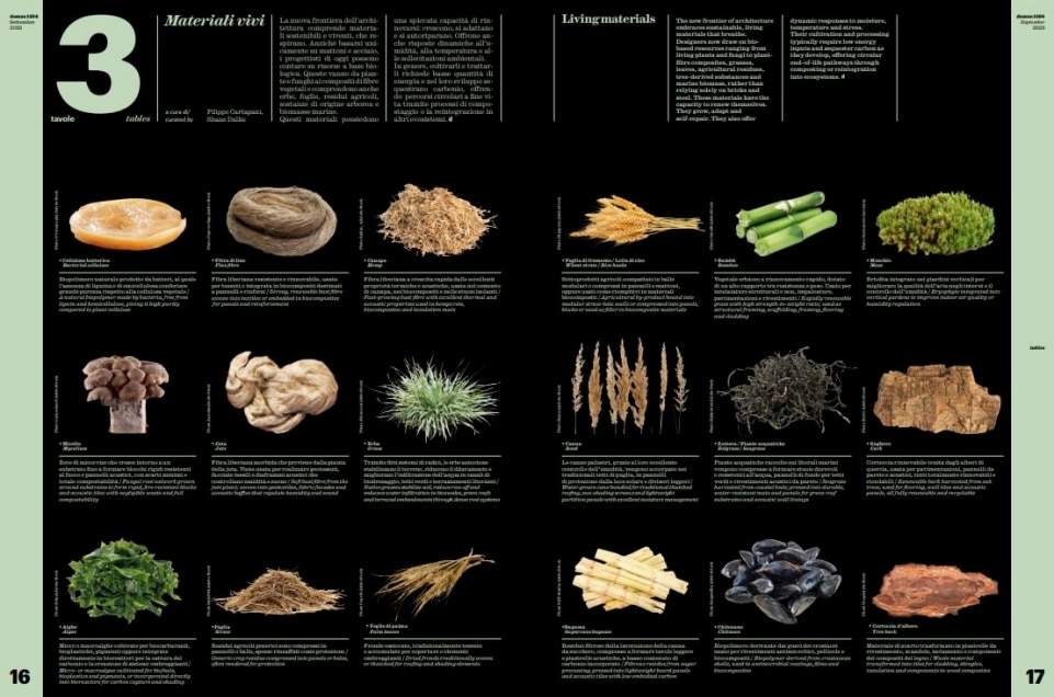 Le recensioni di Loredana Mascheroni su Massimo Rigaglia e di Elena Sommariva su Issey Miyake e Atelier Oï presentano design che utilizzano materiali organici e riciclati, mentre Silvana Annicchiarico celebra la sedia di Aida Rasmussen come manifesto di un design etico e sostenibile. Antonio Armano, nel suo testo su FerreroLegno, sottolinea l'importanza di un'azienda che unisce tradizione, innovazione e rispetto per l'ambiente. In questo contesto, anche l'umile maniglia, come spiega Valeria Casali nel suo testo, può diventare un'opera architettonica, un punto di contatto tra l'uomo e lo spazio.