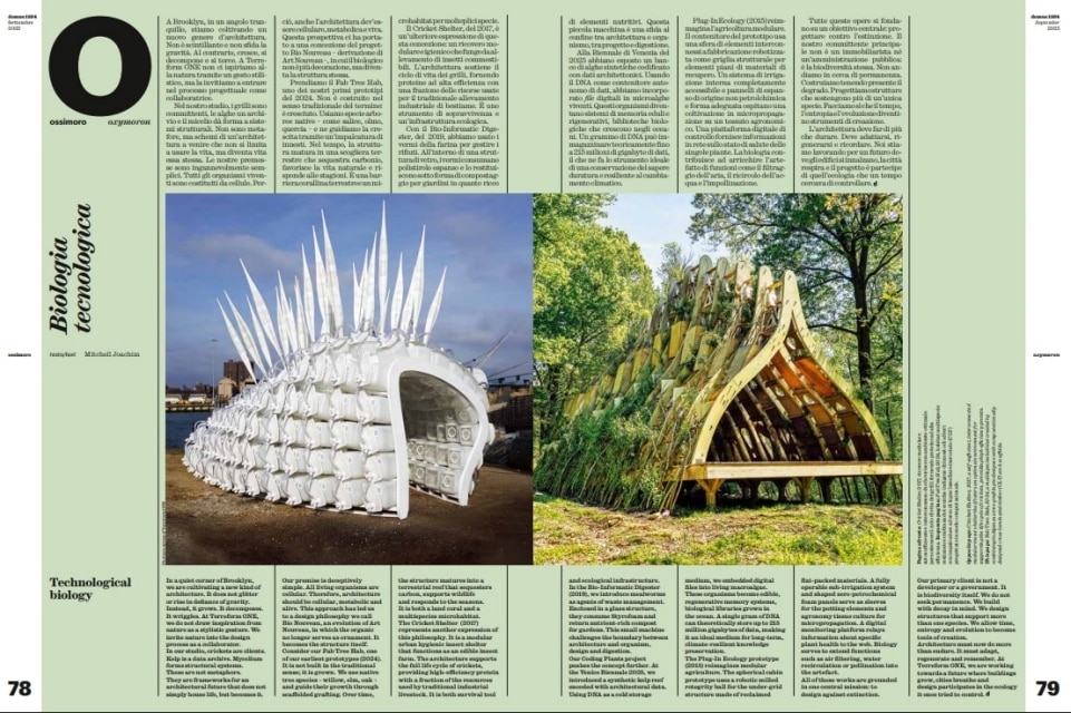 Domus si spinge poi oltre, interrogando il ruolo della scienza e della tecnologia. Julia Watson, con il suo concetto di "Urbanistica TEKnologica", ci ricorda che il vero sapere è già insito nelle pratiche ancestrali, in quelle soluzioni indigene che da sempre si muovono con la natura e non contro di essa. E mentre Ben Lamm in "C'è spazio per l'ottimismo" evoca una scienza capace di riparare gli errori umani, riportando in vita specie estinte e degradando la plastica, Mitchell Joachim in "Biologia tecnologica" spinge questo concetto al limite, immaginando un futuro in cui gli edifici sono veri e propri esseri viventi.