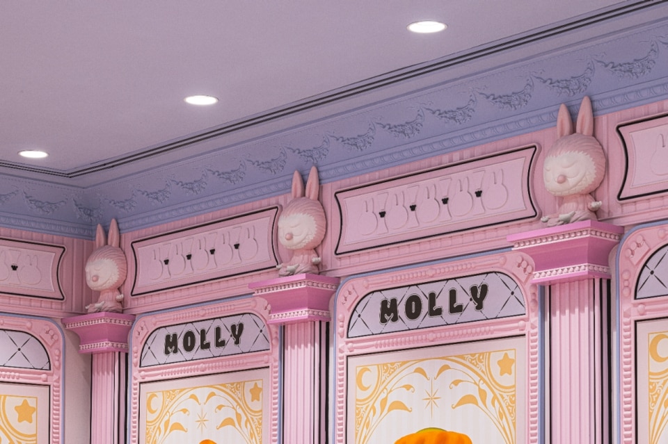 Un’articolazione di spazi concatenati, di visuali prospettiche inaspettate, di forme fluide che avviluppano e vortici che risucchiano decostruisce lo spazio tradizionale sovvertendone i vincoli cartesiani e riformulando nuove geometrie emozionali in cui fanno capolino i fiabeschi bambolotti: dallo spazio di ingresso concepito come un intricato carillon; alla terrazza su cui campeggia l’istallazione Molly alta 4 metri, seduta in cima ad un elefante e con abiti tradizionali thailandesi (omaggio del brand globale alla cultura locale); alle sale espositive al primo e secondo piano, dove pavimenti e pareti si compenetrano formando un caleidoscopio di immagini, colori, arredi e caramelle; alla caffetteria punteggiata da improbabili elementi mutuati dal lessico architettonico occidentale, tra archi, modanature e paraste con capitelli composti dai Labubu in posizione del loto.