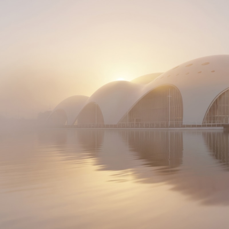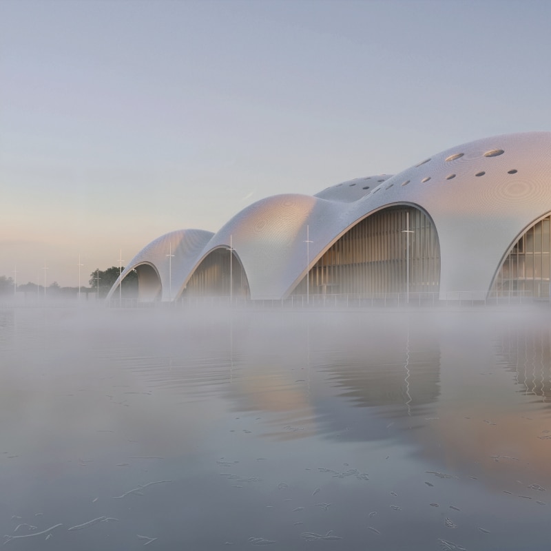 Esternamente, una “pelle pixelata” in ceramica dai toni perlacei si anima di sfumature diverse a seconda delle ore del giorno e delle stagioni, evocando la poetica del guscio cangiante dell’ostrica come scrigno prezioso non di perle ma di musica.