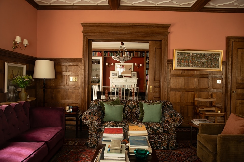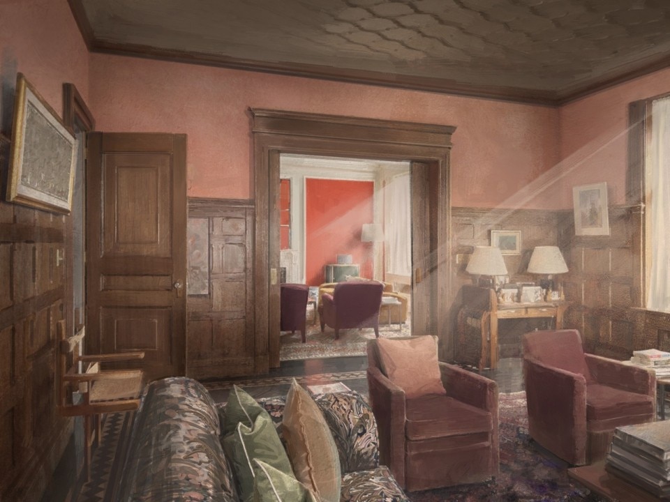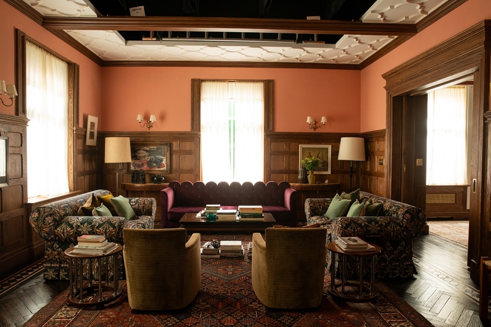 Lo status dei due padroni di casa trasuda in ogni dove: nei divani dalle tappezzerie floreali che rievocano i famosissimi disegni di William Morris, e su cui Hank e Alma siedono in posture la cui informalità tutto lascia intendere tranne che i due possano essere stimati colleghi accademici, nelle sedie e divanetti in legno dalle linee Arts & Crafts, che ancora richiamano all’opera di Charles Rennie Mackintosh o più facilmente ai pezzi d’arredo che Frank Lloyd Wright realizza per le sue case americane più iconiche.