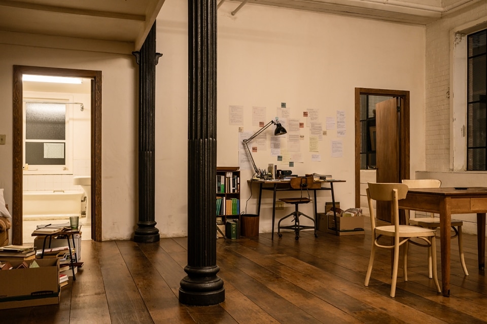 Baisi racconta come la costruzione dell’appartamento sia avvenuta attraverso l’immaginazione di una serie di “stratificazioni di vita”, tre layer generazionali nello specifico, dai nonni ai genitori di Frederick, i primi emigrati dall’Europa verso l’America con l’insorgere del nazifascismo, i secondi vissuti idealmente in quel contesto americano della presidenza Kennedy, fino agli stessi Alma e Frederick.