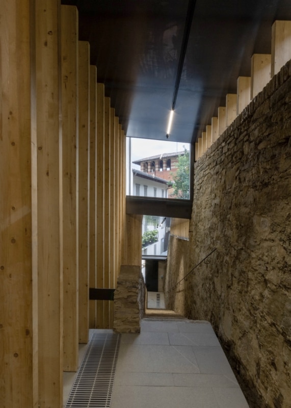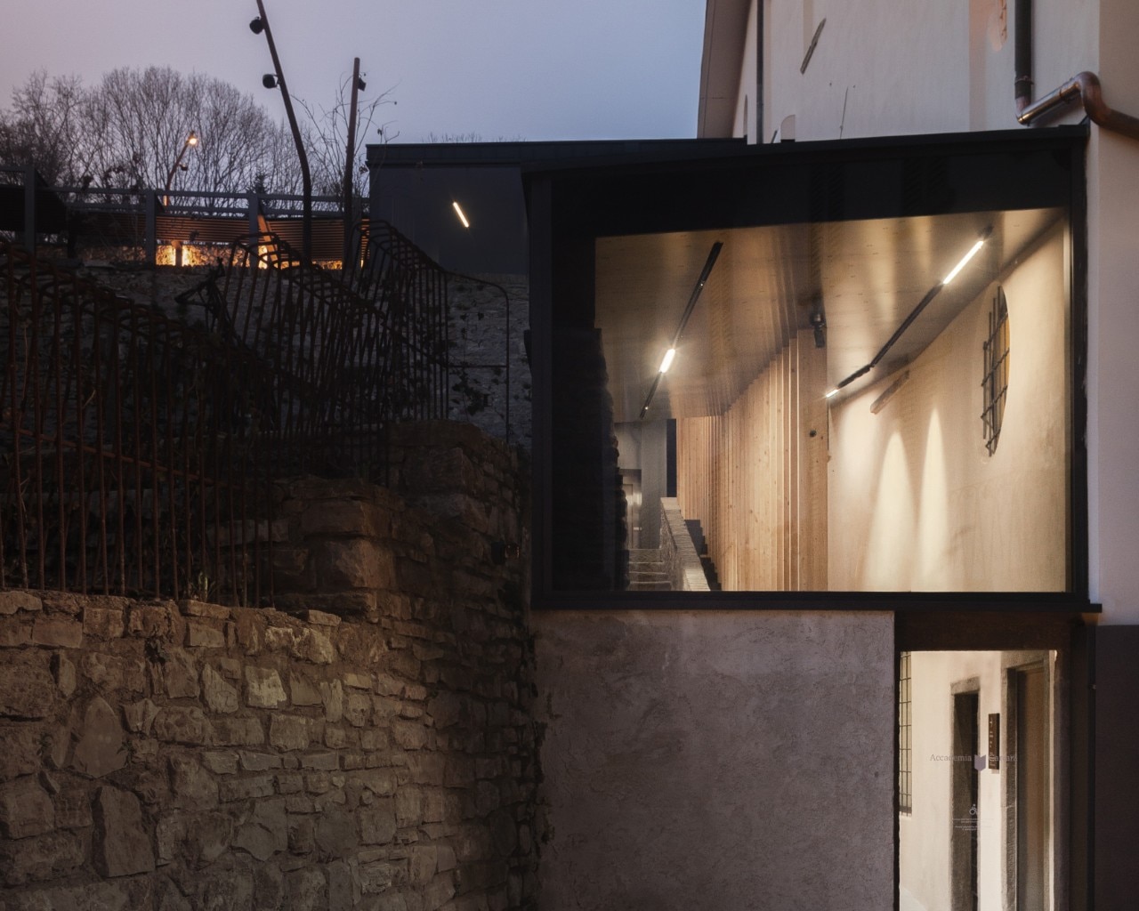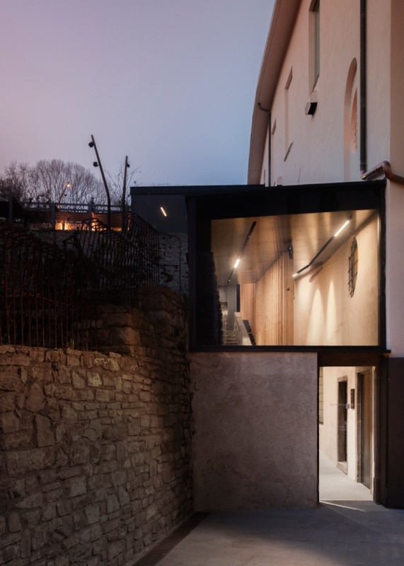 Il lavoro di Antonio Ravalli, selezionato tra trentuno candidature, è stato scelto per la sua capacità di integrare funzionalità contemporanee in un edificio storico, migliorando l’accessibilità e i servizi per il pubblico senza snaturare l’identità del museo. Il nuovo corpo architettonico dialoga con il contesto urbano trasformando un’area di passaggio in uno spazio di connessione: appoggiandosi da un lato sull’antica muratura in pietra che conteneva la collina adiacente, il progetto recupera questo spazio interstiziale e lo rende funzionale, in continuità con i nuovi Giardini Pwc.