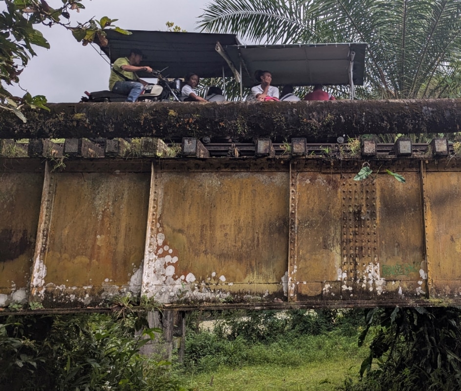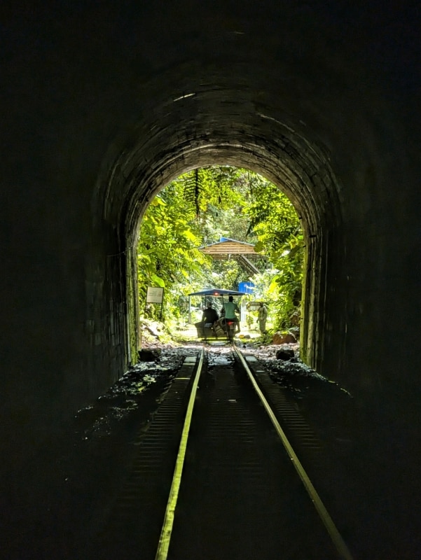 Attraverso una giungla selvaggia, su ponti sospesi e dentro tunnel umidi, queste brujitas — letteralmente “piccole streghe”, come vengono chiamati i veicoli — sfrecciano tra le curve, stridendo e sobbalzando sui vecchi binari ferroviari. Se un treno dovesse improvvisamente comparire, o se un’altra brujita arrivasse in senso opposto, i conducenti chiedono semplicemente ai passeggeri di scendere, poi sollevano la piattaforma e la spostano a lato dei binari.