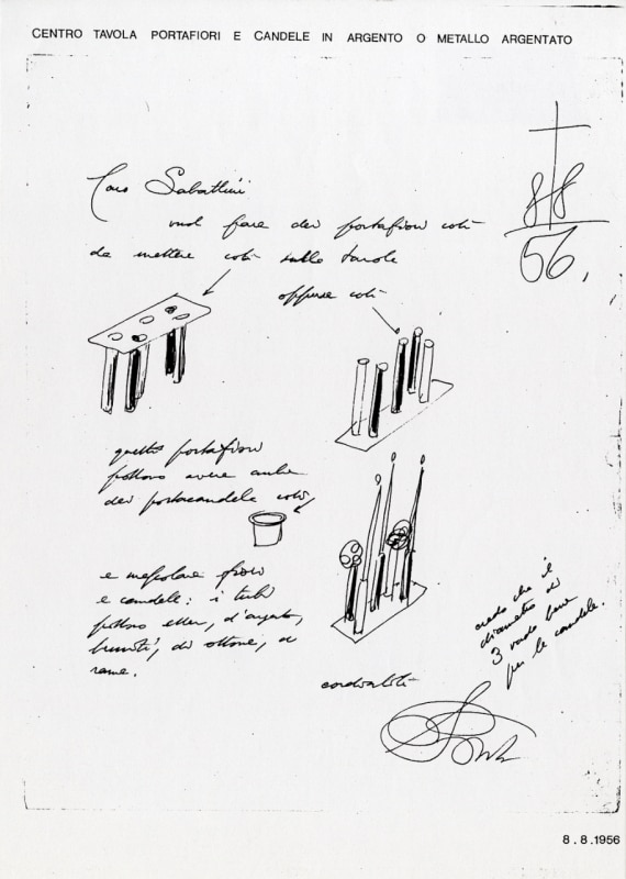 Gli oggetti - diversi per uso, forme e materiali - indicano l’approccio poliedrico di Gio Ponti, esito pure di un instancabile scambio con le personalità e le realtà più influenti del suo tempo, come l'argentiere Sabbatini, il laboratorio Buccheri Antonio Rossi di Gubbio e l'ingegnere Pier Luigi Nervi, partner nella progettazione del Grattacielo Pirelli. Gli oggetti realizzati con Lino Sabbatini - in argento nella versione originale - rinascono in acciaio inossidabile, accanto al set di “Bottiglie” in legno e il vaso di bucchero, frutto di una ricerca sensibile e attenta sul materiale.