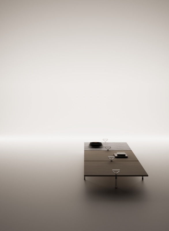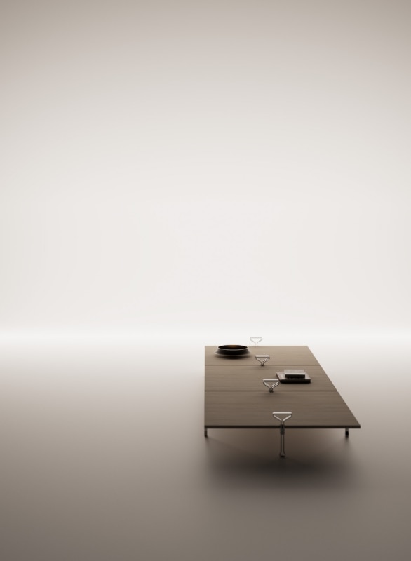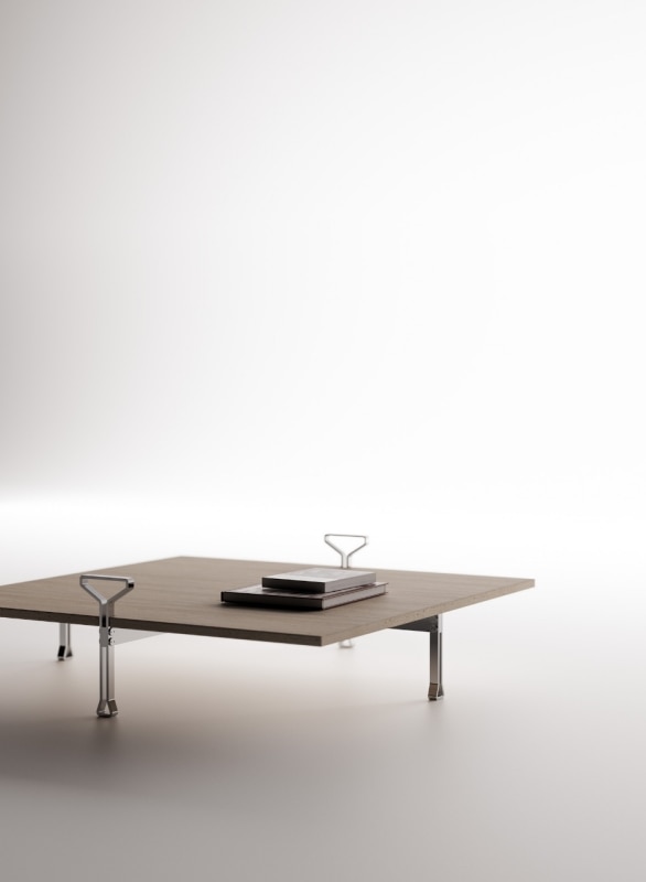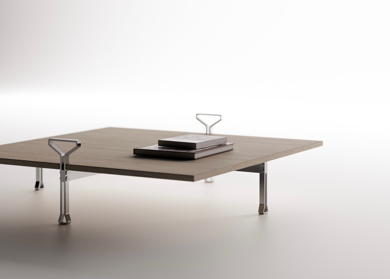 Una struttura in alluminio, disegnata a croce e con giunzioni meccaniche a vista, sostiene il grande piano quadrato in marmo, semplicemente appoggiato alla base per gravità. Le maniglie metalliche non cercano di nascondere o mimetizzare la loro forma, che è anche la loro funzione: facilitare lo spostamento dell’oggetto.