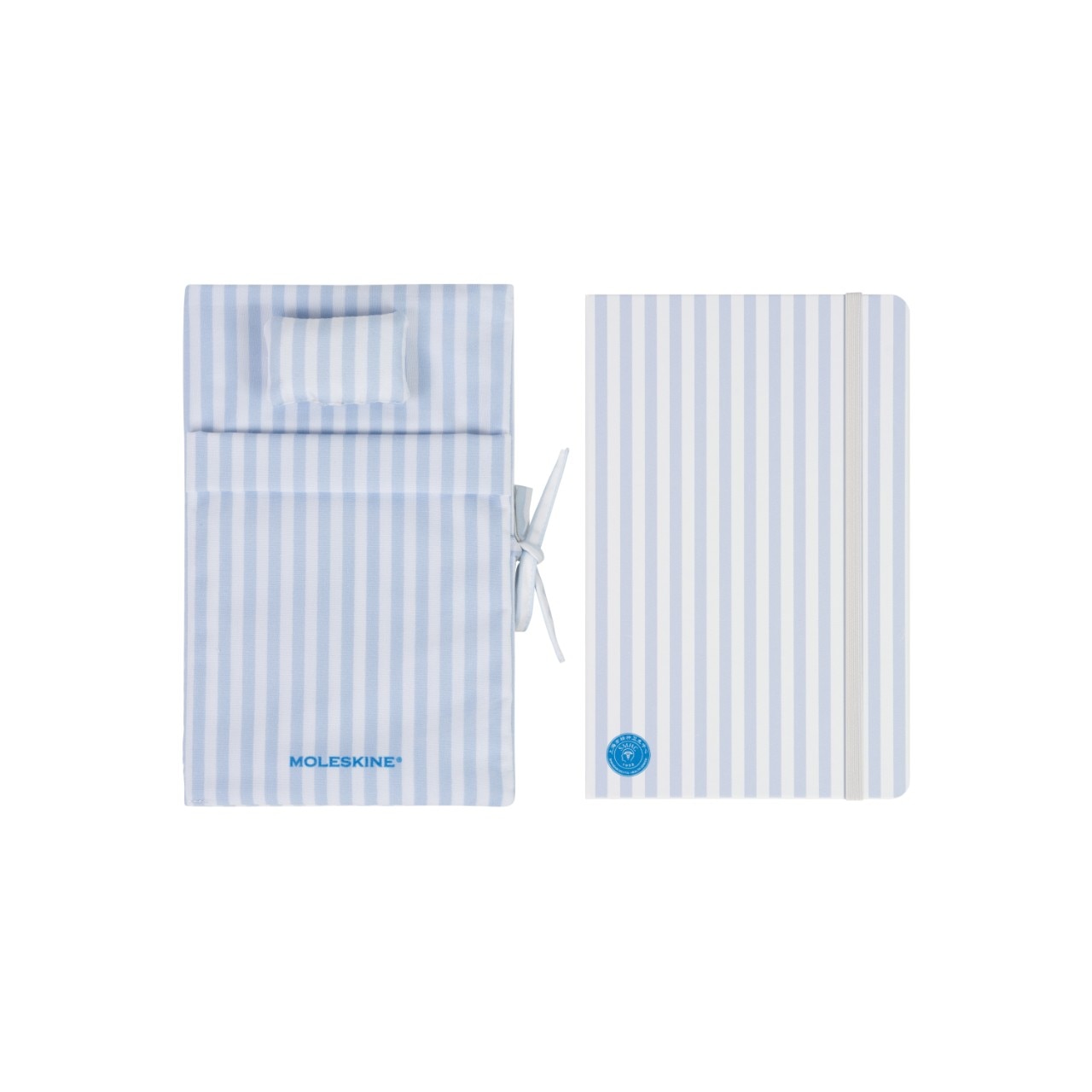 Tra questi, l’Emotional Care Large Notebook Set: un taccuino di grande formato con copertina in tessuto a righe blu e bianche e patch “No. 600”, che richiama visivamente l’estetica dei letti ospedalieri attraverso cromie e materiali tipici dell’arredo clinico.