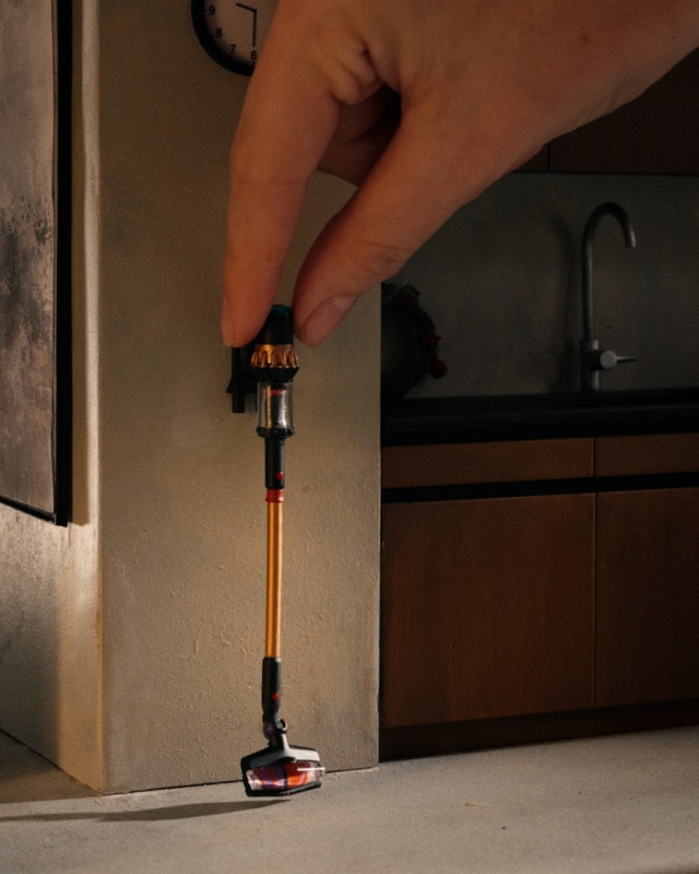 La casa è realizzata in scala 1:12 ed è arredata come un vero ambiente domestico. Ogni stanza ospita versioni miniaturizzate di aspirapolvere, asciugacapelli, purificatori e lampade. Ma il punto non è la fedeltà formale. Il punto è il processo. La mini casa diventa un dispositivo narrativo per mostrare il lavoro del team interno di modellazione e prototipazione, quella fase intermedia e spesso invisibile che separa l’idea dal prodotto finito.