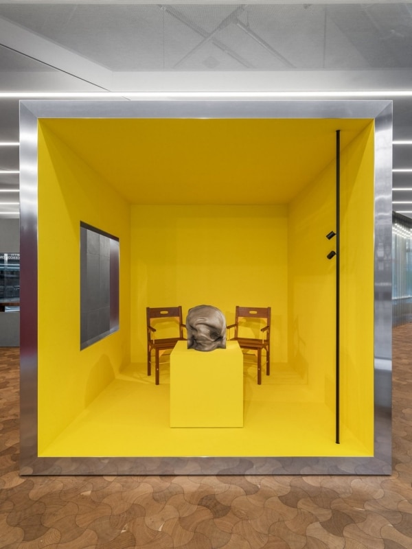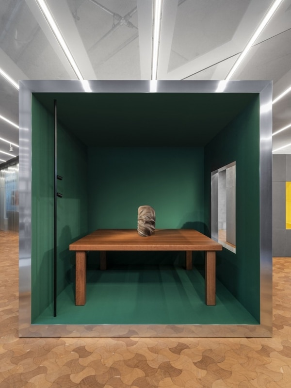 Quattro grandi cubi diventano stanze monocromatiche, colorate con tinte rintracciabili nel lavoro di Rossi e concepite come piccole architetture museali in cui si riconosce una certa “urbanicità”, tradotta nella scala delle sculture e di quegli arredi che nel 1994 venivano raccontati su Domus 766 così: “il legno chiaro è protagonista, abbinato a colori cari al progettista: giallo becco d’oca per gli elementi di giunzione della sedia, rosso Cina o azzurro Madonna per la libreria. Quest’ultima è costituita da una serie di scatole cubiche in lamiera verniciata (interasse 45 cm), aggregate a piacere sia in altezza sia in larghezza, unite con ribattini le une alle altre, controventate da tiranti posizionati tra le file di elementi e chiuse da una facciata finestrata. Questa sorta di curtain wall è ottenuta tagliando un unico pannello di compensato, di cui pertanto si conserva il disegno. I vetri sono a filo esterno del telaio e vengono fissati a secco. I fianchi sono in lamiera ondulata verniciata.”