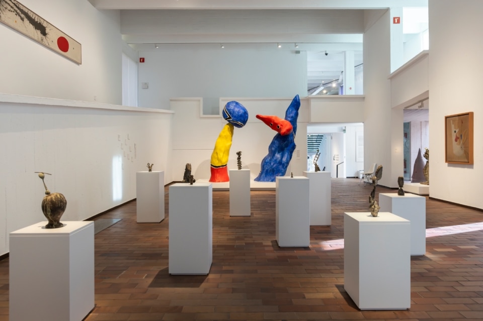 La stessa logica interna del riallestimento segue gli assi portanti della sua visione artistica, qui pensati in totale concordanza con l’architettura di Sert e così suddivisa in 10 filoni: Place, Balance, Doing and letting things happen, Circles, Open and close, Rhythm, Near and far, Up and down, Large and small, Inside and outside. Se in Place Man and Woman in front of a Pile of Excrement e Village and Church of Mont-roig raccontano di un radicamento emotivo e materiale con la sua terra natia, in Balance ogni forza gravitazionale viene a mancare. La solidità di un centro di riferimento non rientra nel linguaggio volatile e calligrafico di Woman and Bird in the Night, e le “cappelle” meditative di Doing and Letting things happen si trovano all’incrocio di questi due impulsi, o stati relazionali col mondo.