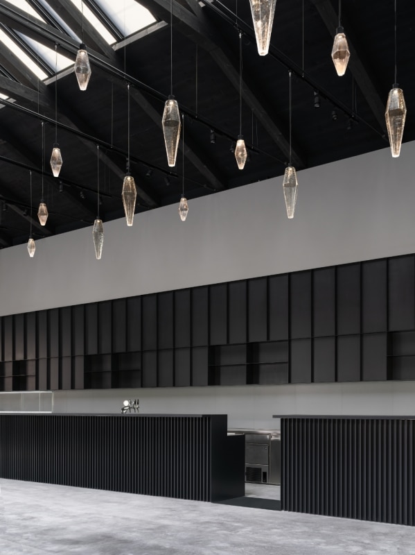 Le immagini mostrano un ambiente agli antipodi rispetto al precedente. Il bar di Rehberger era un interno saturo, optical e fortemente immersivo, costruito su contrasti grafici, superfici specchianti e arredi scultorei dai colori accesi. Il nuovo progetto adotta invece un registro sobrio, funzionale e rarefatto.