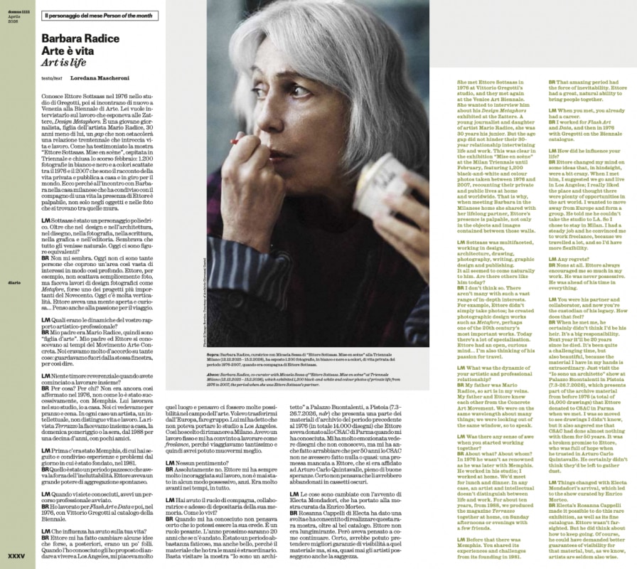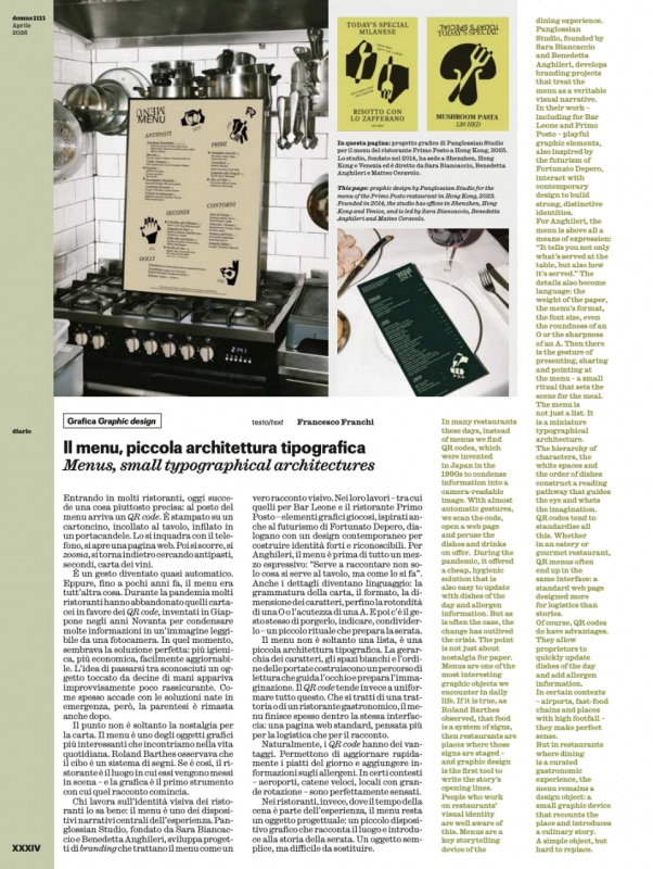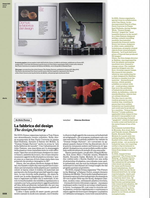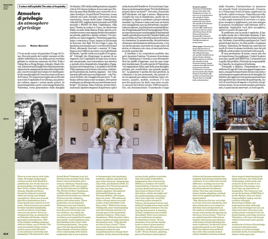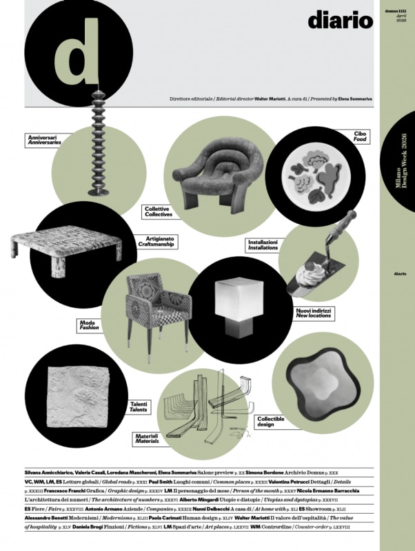 Il Diario è il luogo dove Domus conversa: dall'archivio del 2001 con la Domus Design Factory nella chiesa sconsacrata di San Paolo Converso allestita da John Pawson, al mosaico raccontato da Paul Smith, dal Nando's sotto casa alla Cappella Palatina di Palermo del XII secolo, come forma del tempo: durevole, adattabile, irriproducibile dall'intelligenza artificiale. Valentina Petrucci intervista Andrea Crisanti, che parla d'arte con la stessa passione analitica che riserva alla scienza. Francesco Franchi riflette sul menu come piccola architettura tipografica e sulla sua graduale sostituzione con il QR code. Loredana Mascheroni incontra Barbara Radice nella casa milanese che divise con Ettore Sottsass per trent'anni. Walter Mariotti racconta Valentina De Santis e il trittico del Lago di Como come una produzione di senso più che un'esperienza d'accoglienza: ospitalità non come servizio standardizzabile, ma come apertura delle porte di casa propria.