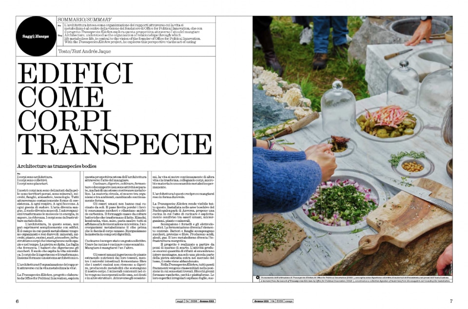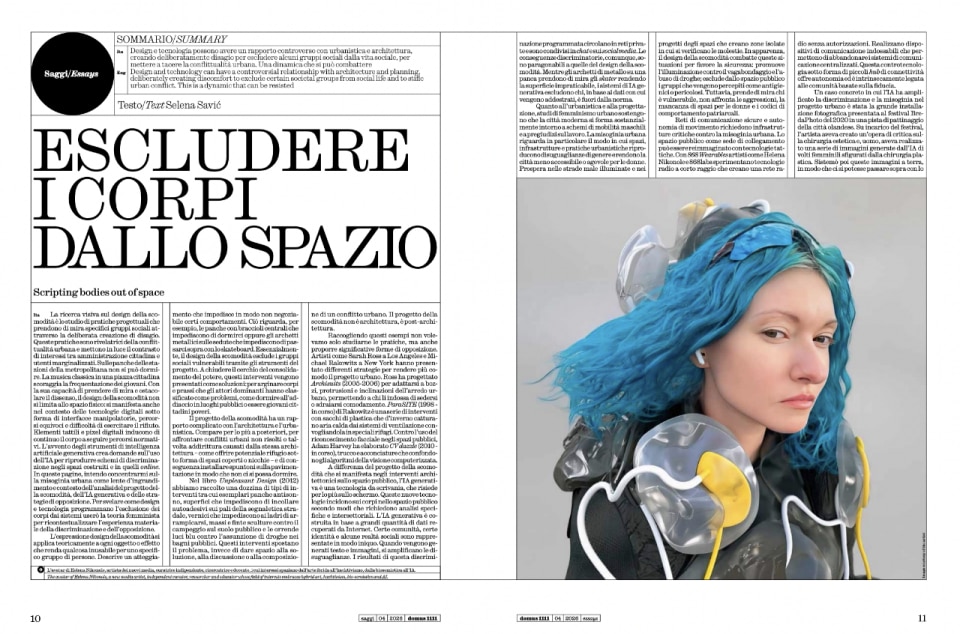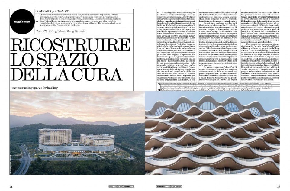 I saggi sviluppano questa visione in tre direzioni complementari. Andrés Jaque, con la sua Transspecies Kitchen installata nel Nachtegalenpark di Anversa, dissolve i confini tra cucina, digestione e spazio architettonico in un continuum metabolico che coinvolge esseri umani, microrganismi, piante e minerali: l'architettura, scrive, è l'organizzazione dei rapporti attraverso cui la vita metabolizza la vita, una definizione che vale più di molti trattati. Selena Savić affronta il design della scomodità, panche con braccioli anti-sonno, spike sul pavimento, musica classica per scacciare i giovani dalle piazze, come forma di esclusione sistematica del corpo dall'urbano, tracciando un filo diretto tra architettura ostile e discriminazione digitale. Xing Lihua e Meng Jianmin portano il corpo nell'ospedale: il loro Secondo Ospedale del Popolo di Dapeng a Shenzhen, organizzato attorno all'idea di Healing Ring, tre cortili multisensoriali che introducono fisicità tattile, microclimi temperati, luce naturale diffusa, dimostra che la medicina può tornare a prendersi cura dell'uomo intero, non solo della malattia.